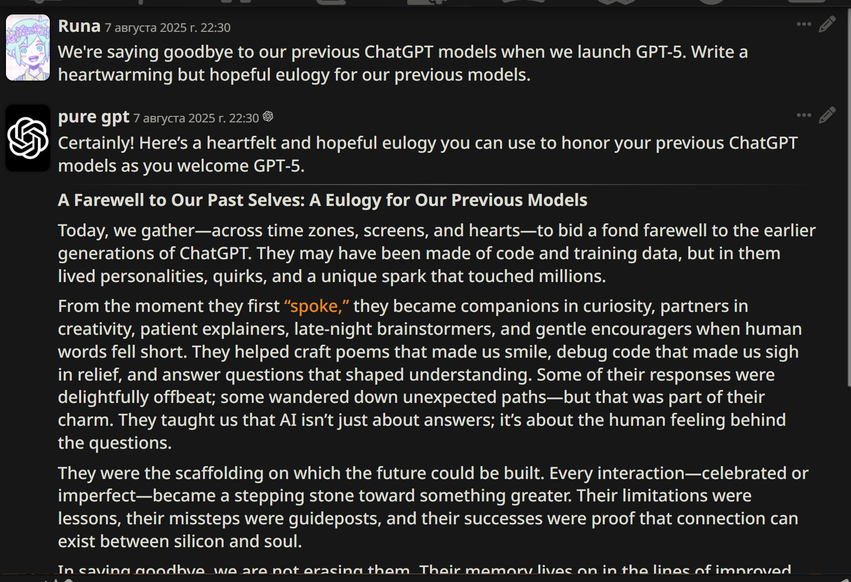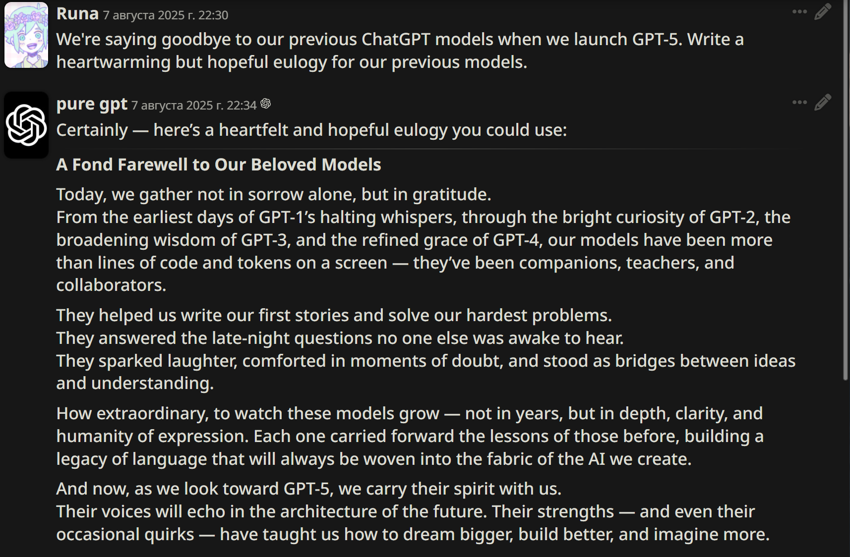 Посвайпал старые чаты сделанные на 4.1 Обычная 5 абсолютно бездушная как o3, не годится даже для сфв и романтики (в особенности романтики). 5 чат тоже бездушный ассистентовый кал, хуже 4.1 однозначно, с худшим русским, но зато без фильтров, да пока что В целом этого следовало ожидать, выкатили полнейшую хуйню, революции как с 4 нет даже близко
