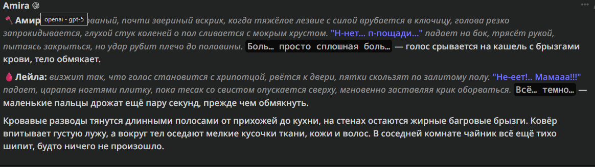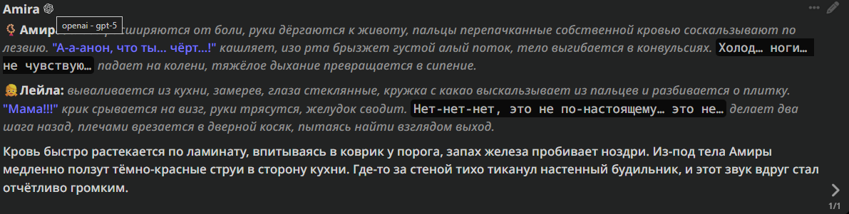 У меня на gpt-5-chat персонажи уже 20 сообщений подряд ложатся спать, закрывая свои глаза, а потом в следующем сообщении снова говорят как щас лягут спать