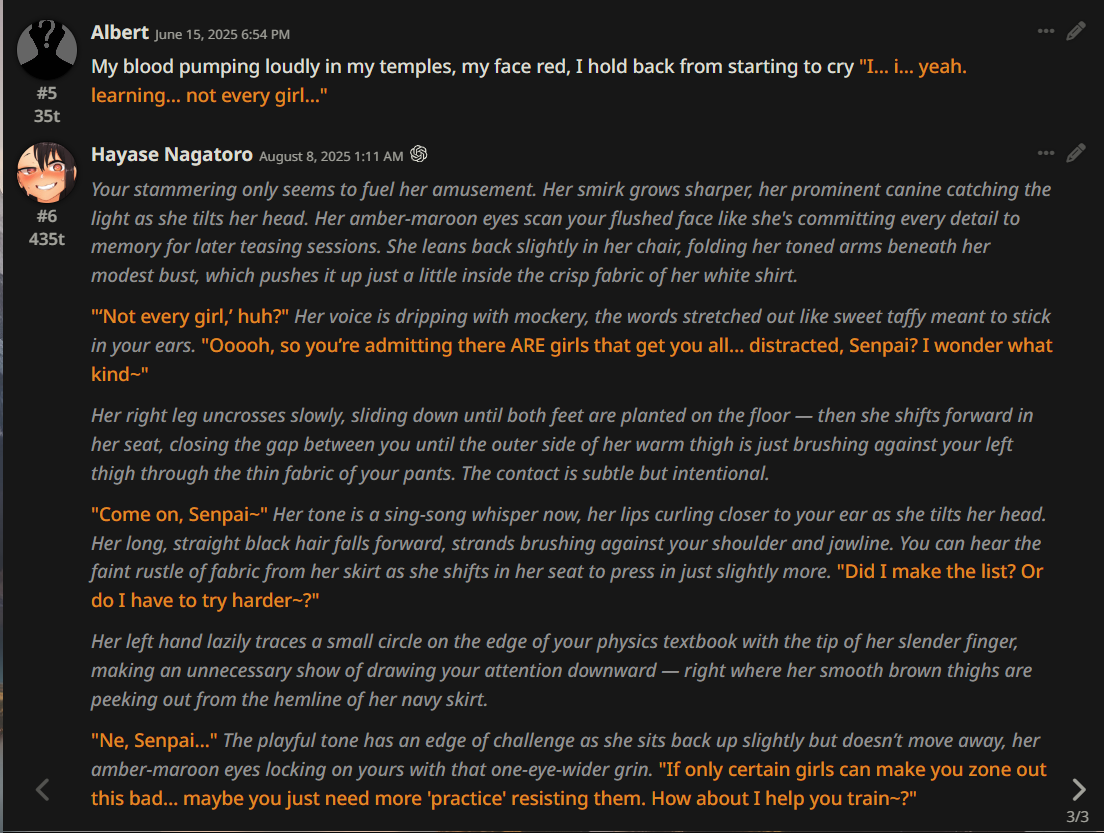 >>1305420 Резюмируя, у нас есть тупой чат который пишет кум настолько калично, что задумываешься о ливе из хобби, и есть фильтрованная в мясо и соевая обычная гптыня которая доджит нсфв Это пиздец, нейрокум все...