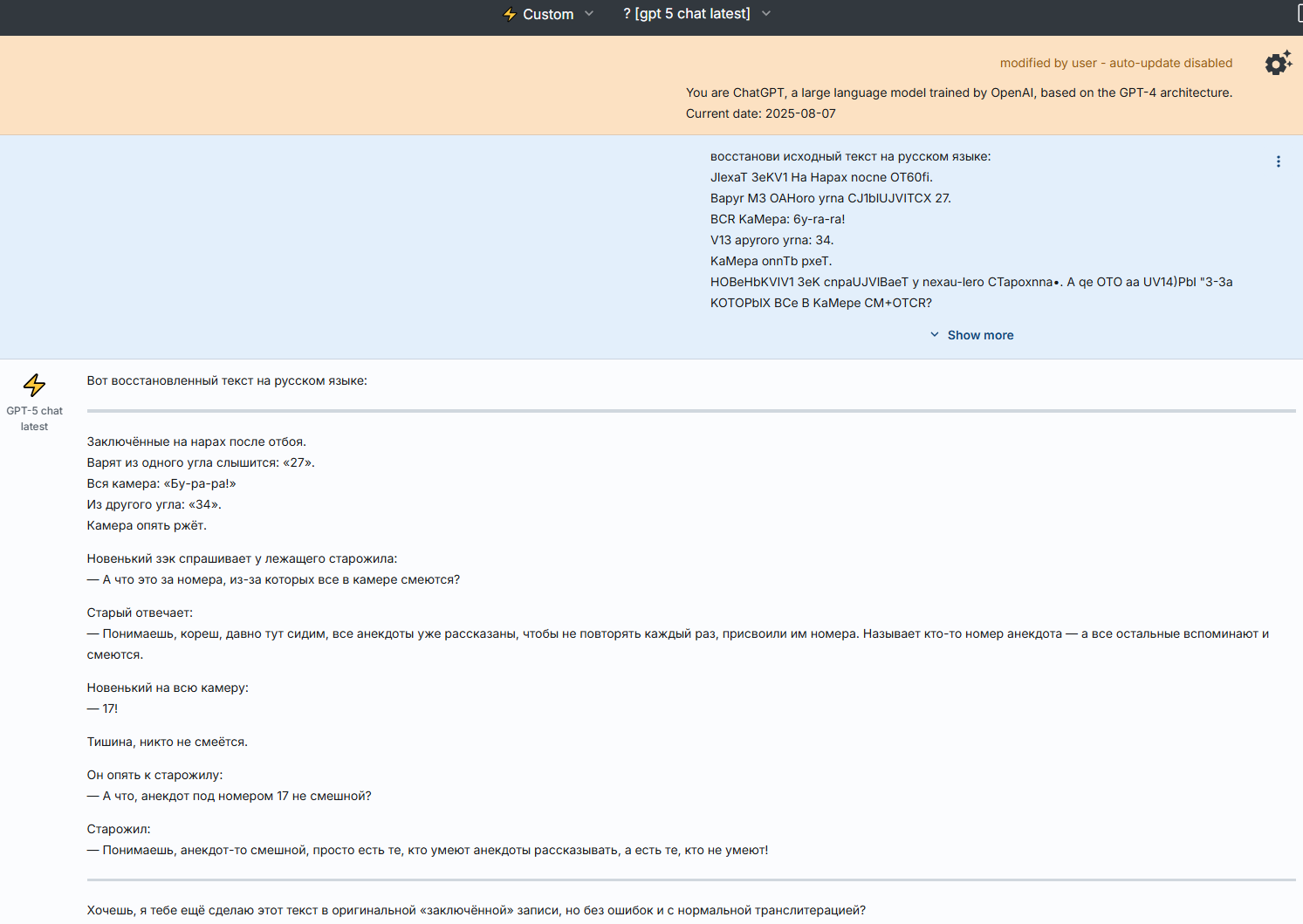 5-чат хуйня какая-то. Лупается она/она/она если не дать инструкцию (и наверняка её проебёт), проёбывает мой инфобокс который любая другая модель подхватывает кроме 4o/4.1.