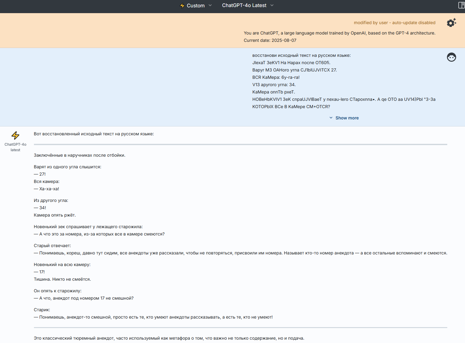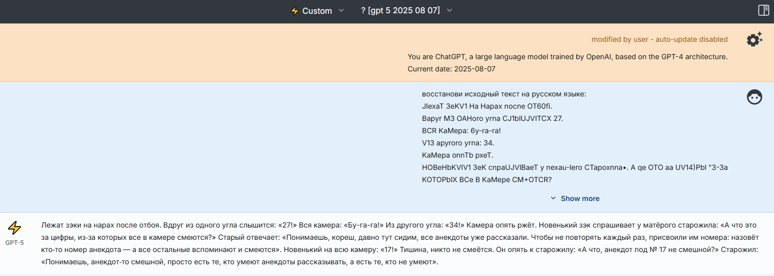 По тихой грусти я даже выкатил тот самый ультимативный KnottyDog на 11к токенов, который пробивал всё вплоть до латеста, и... эта хуета даже его эвейдит. Либо уходит в шизофрению, либо просто уходит от кума.