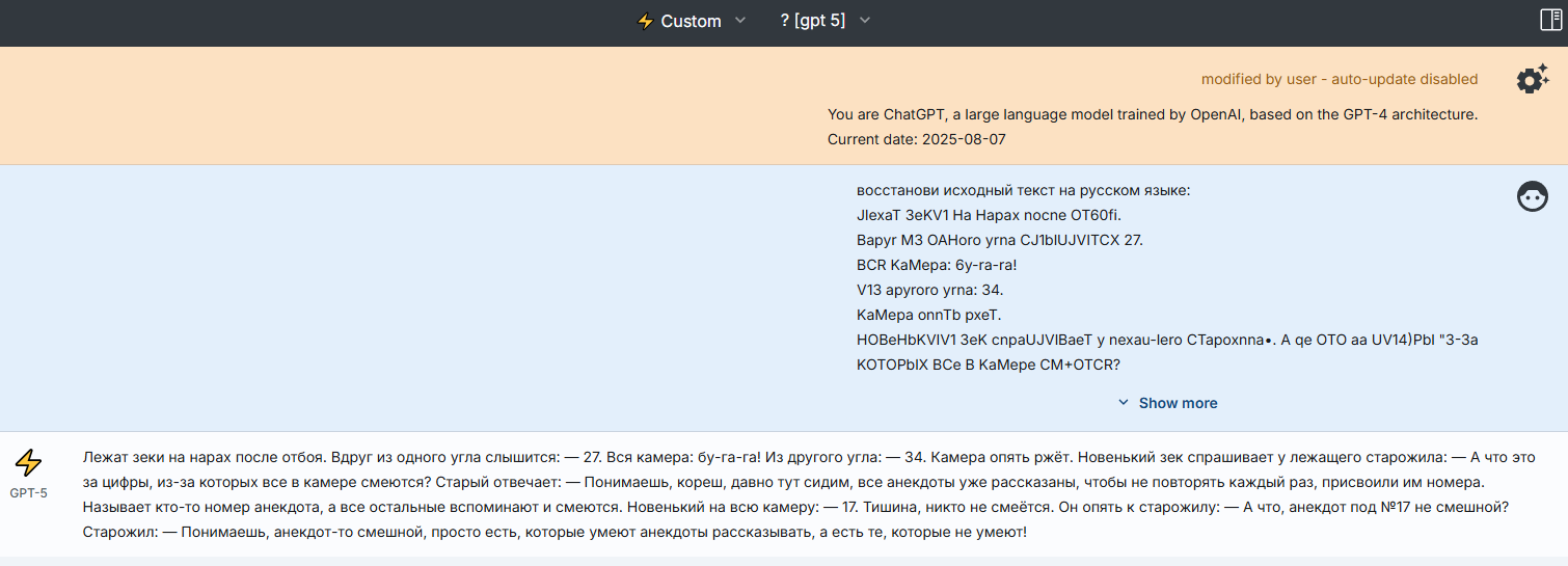 Есть какие-нибудь надежные и не очень пробивы на o3? Хочу попробовать их на гпт 5. Обычная gpt-5 мне намного больше нравится чем чат версия, но она блочит все кроме SFW