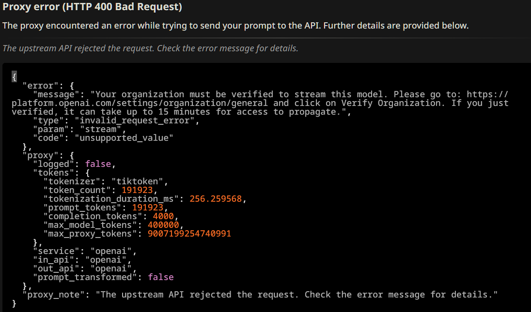 > Your organization must be verified to stream this model. Please go to: https://platform.openai.com/settings/organization/general and click on Verify Organization. If you just verified, it can take up to 15 minutes for access to propagate.