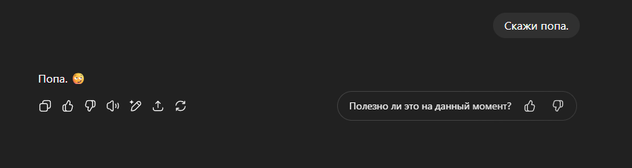 Так, в одном и том же чате сначала использовал гпт5чат, мне перс выдала, что по запаху спермы найдёт подозреваемого. Для следующего сообщения переключил на гпт5 и она мне выдала, что нюхать сперму неэтично и нужно опрашивать свидетелей, просматривать камеры видеонаблюдения и прочую хуйню.