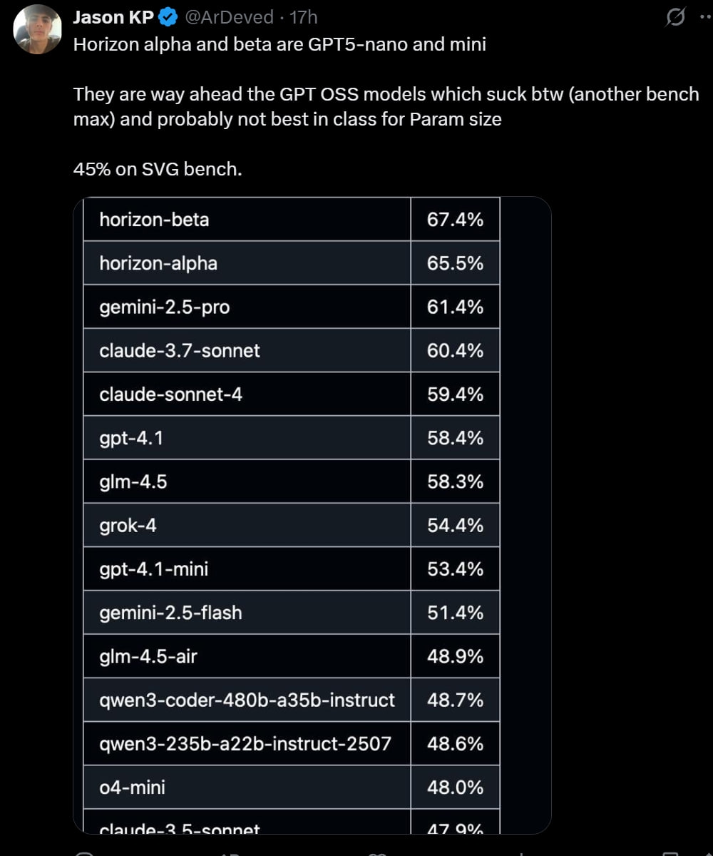 >>1302572 >svg bench Это та хуйня в которой модель просили сгенерировать svg картинку? Я уже подумал хуле Gpt-5 нано лучше чем gemini 2.5 pro, но потом увидел это и понял что хуйня. Ультра очевидно, что их файнтюнили специально под эту задачу. Они там и тени и градиенты рисуют, короче наеб и отвлечение от реальных бенчмарков