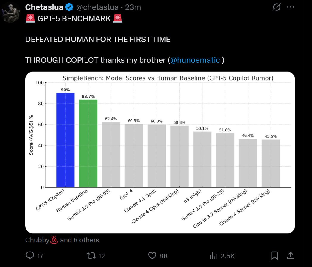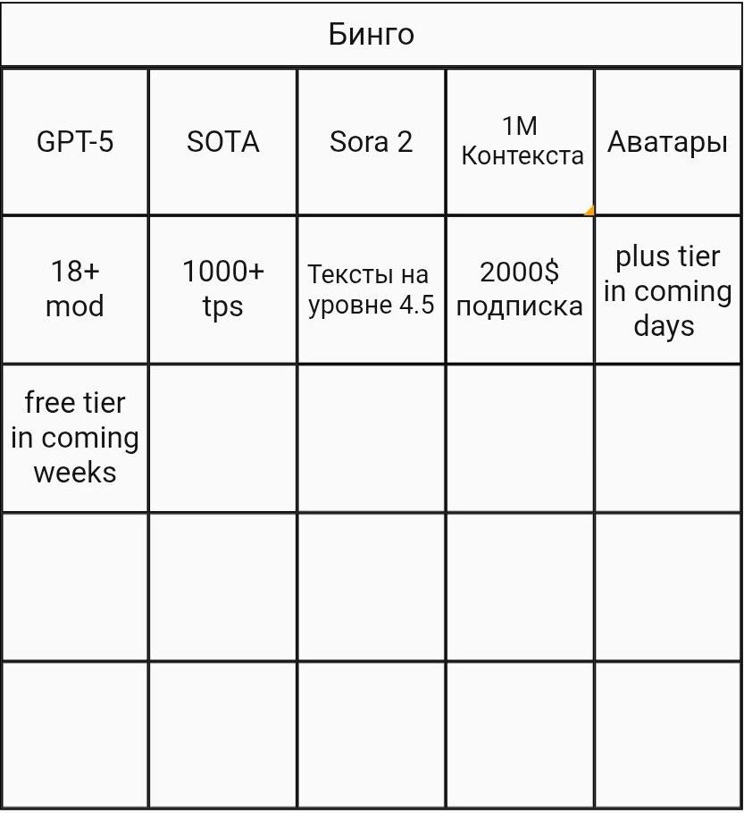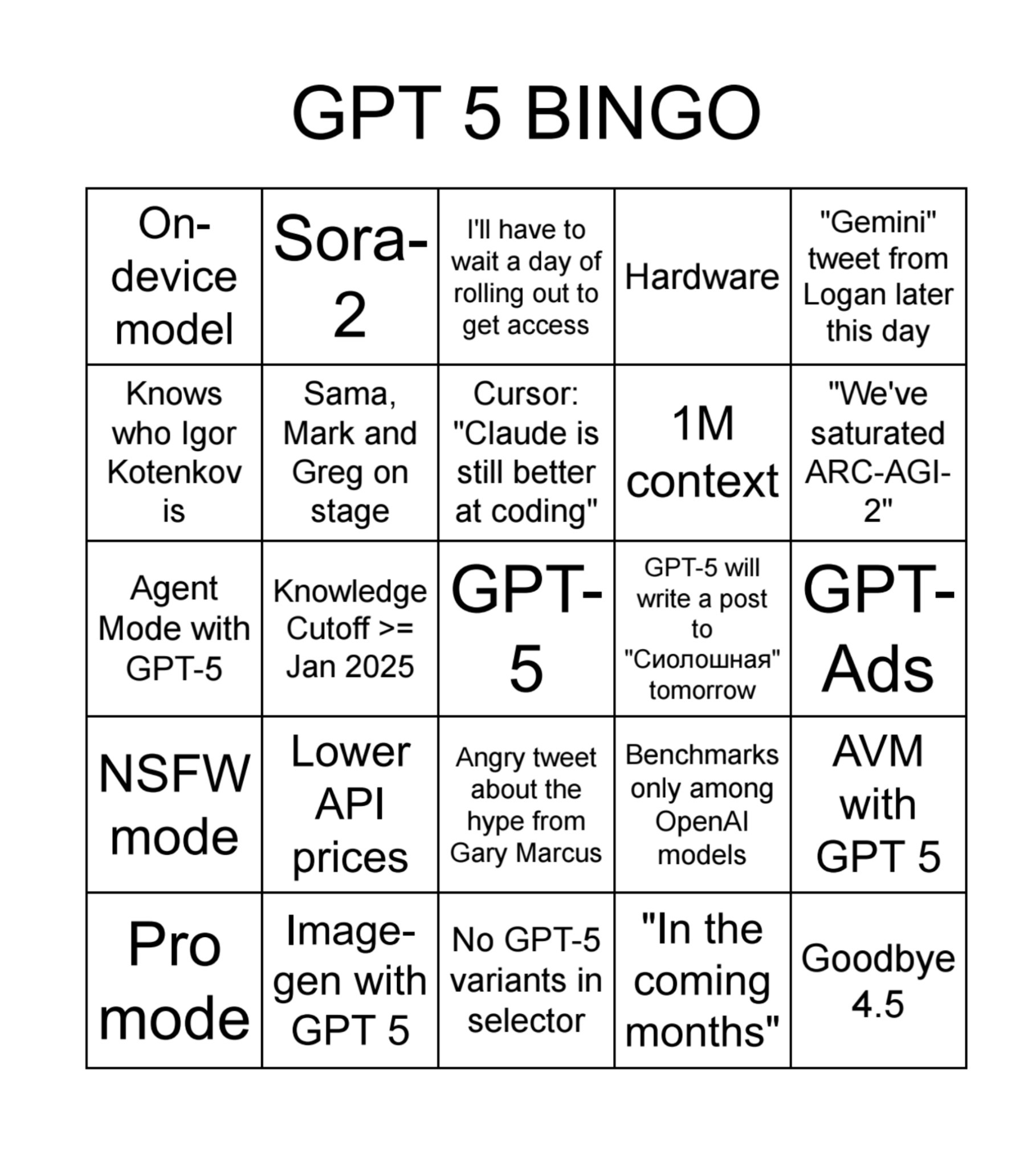 Наверняка я про что-то забыл. Из грустного в глаза бросается отсутствие чего-либо, оценивающего мультимодальность (хотя бы работу с изображениями, не говоря про видео и аудио). И, конечно, очень хочется услышать про ранние тесты в разны бизнес-ориентированных компаниях, которые расскажут, насколько в их real world кейсах GPT-5 лучше.