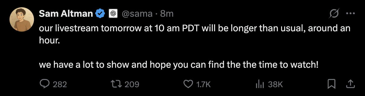 Стрим через ПЯТЬ часов. Судя по анонсу, OpenAI заготовили коллаб с deadmau5
