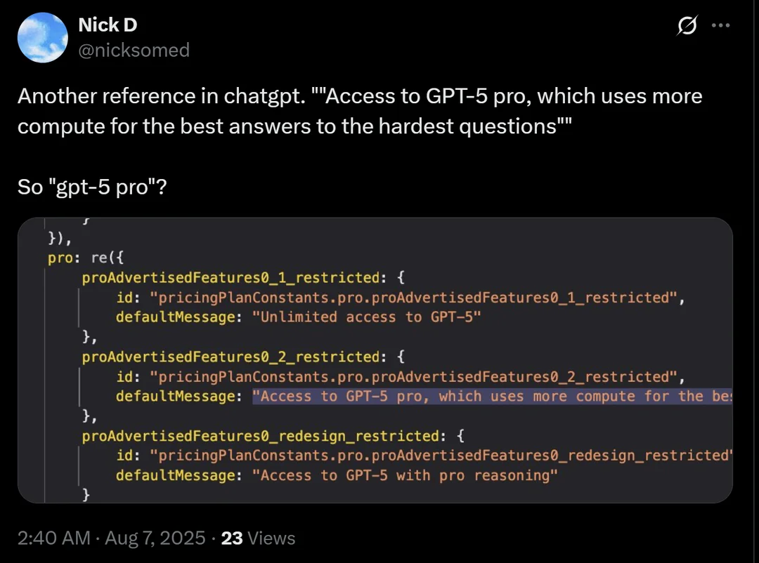В сети появились утечки из кода OpenAI с подробностями о тарифах для GPT-5. Похоже, нас ждут сразу три версии: GPT-5, GPT-5 Pro и GPT-5 Thinking.