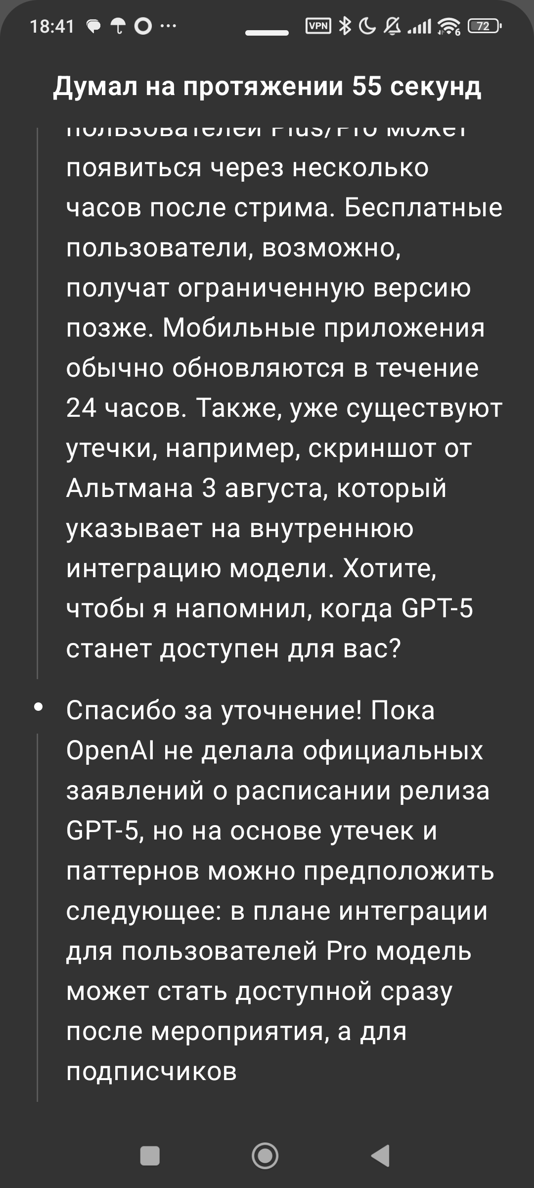– Сегодня раскатят на ВСЕХ юзеров. Да, даже на бесплатных. Ризонинг с ограничениями, но лимиты – норм. Если достигли лимита GPT-5, вас перекинут на GPT-5 mini.