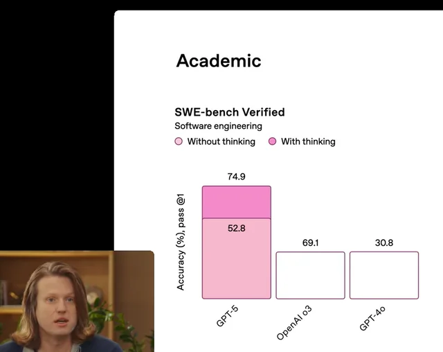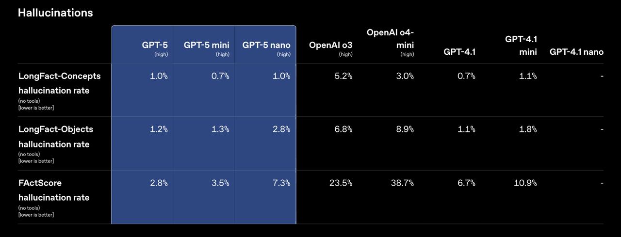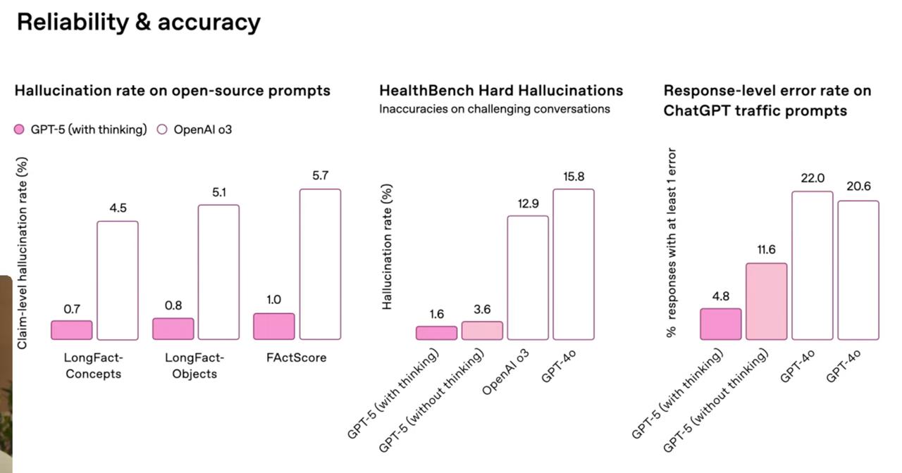 —GPT-5 Pro: при оценке более 1000 экономически значимых, реальных задач на рассуждение внешние эксперты в 67,8% случаев отдавали предпочтение GPT‑5 pro, а не GPT‑5 thinking. GPT‑5 pro допускала на 22% меньше серьёзных ошибок и показала лучшие результаты в области здравоохранения, естественных наук, математики и программирования.