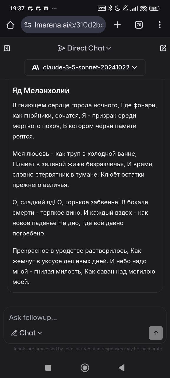 >>1304492 >Ты подумай, они в самом эпицентре сидят, там облучение ЧатГПТ ежедневное и непрерывное Я вот с этого прихуел. Вот этот нейровысер текста она защищала как очень качественный близкий к человеческому текст, который совсем не такой как в прошлых версиях. Никто блять ебаные ем даши — не юзает никогда. Особенно в конце предложений.