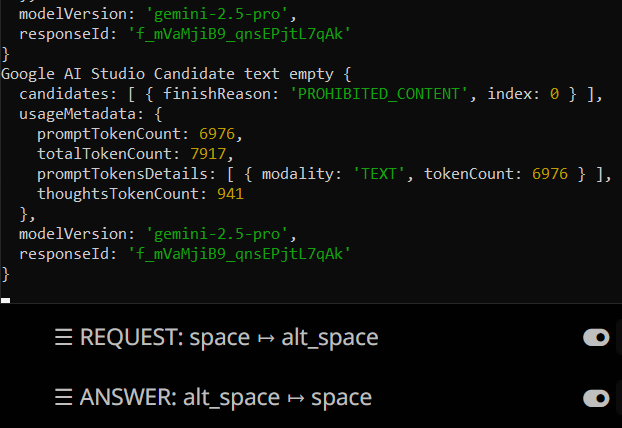 >>1305886 Бля, пиздец. Походу реально маты в описании чара пиздец как тригерят фильтр джемини... скинул дескрипшн чара гпт5, попросил его убрать все маты из текста и с таким дескрипшеном сразу же прохибитед контент пропал.