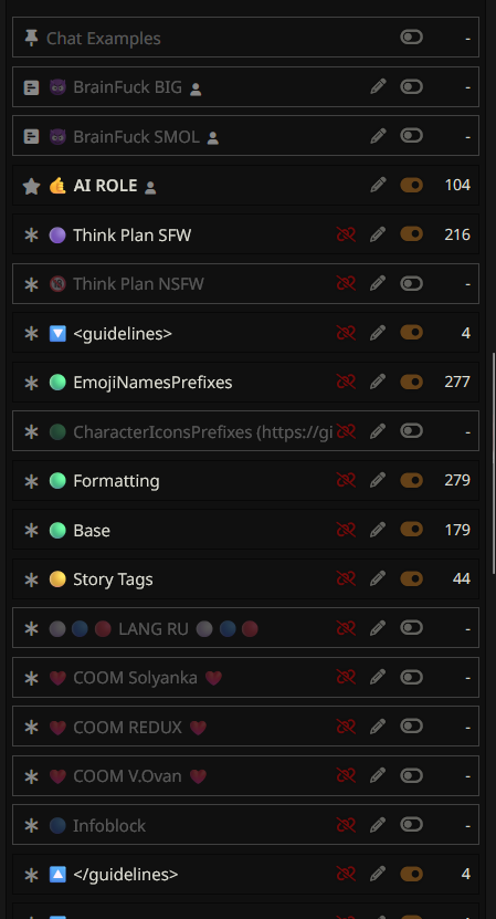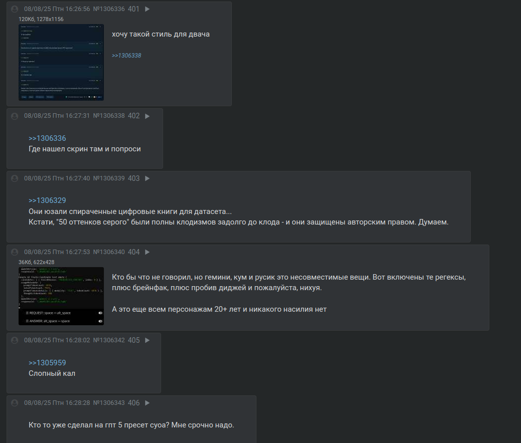 > Аноны! Почему сетканейм всегда куколдит меня в любых ситуациях? > Какой пресет используешь? > Пресет от Дяди Кука, вот ссылка... > Открываешь пресет и смотришь промпты > "Всегда кукай юзера и вставляй колкие унизительные шутки от чара в любой ситуации."