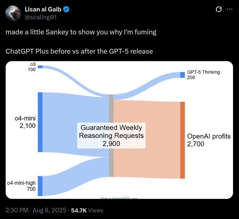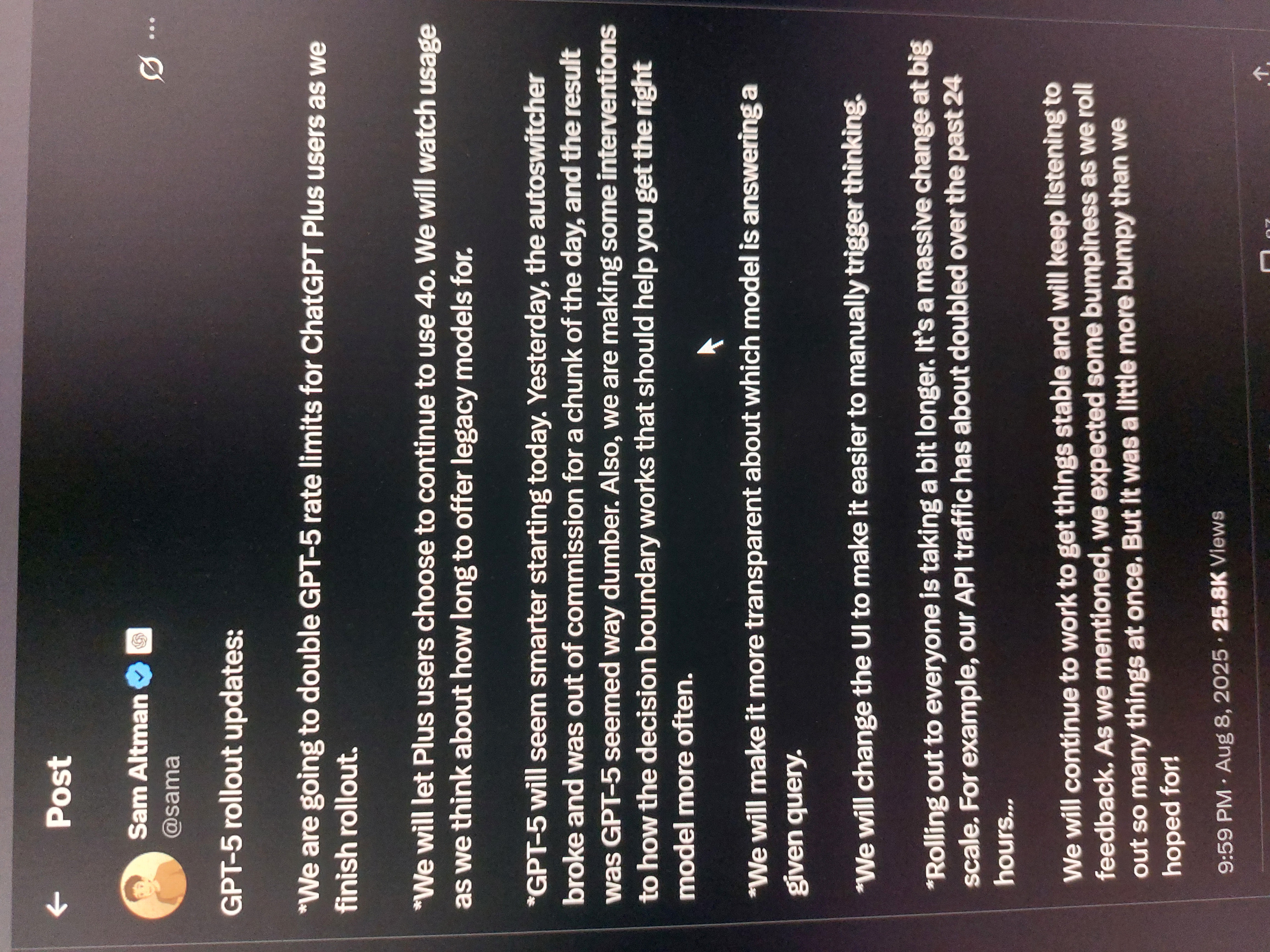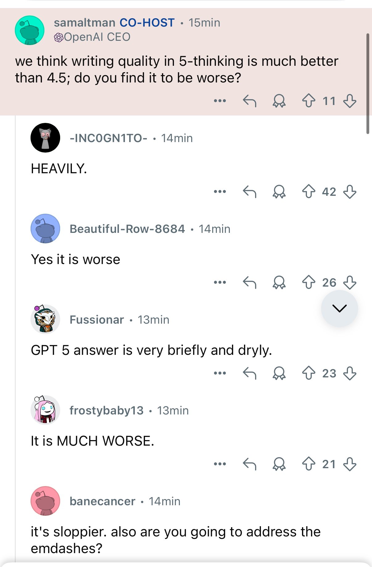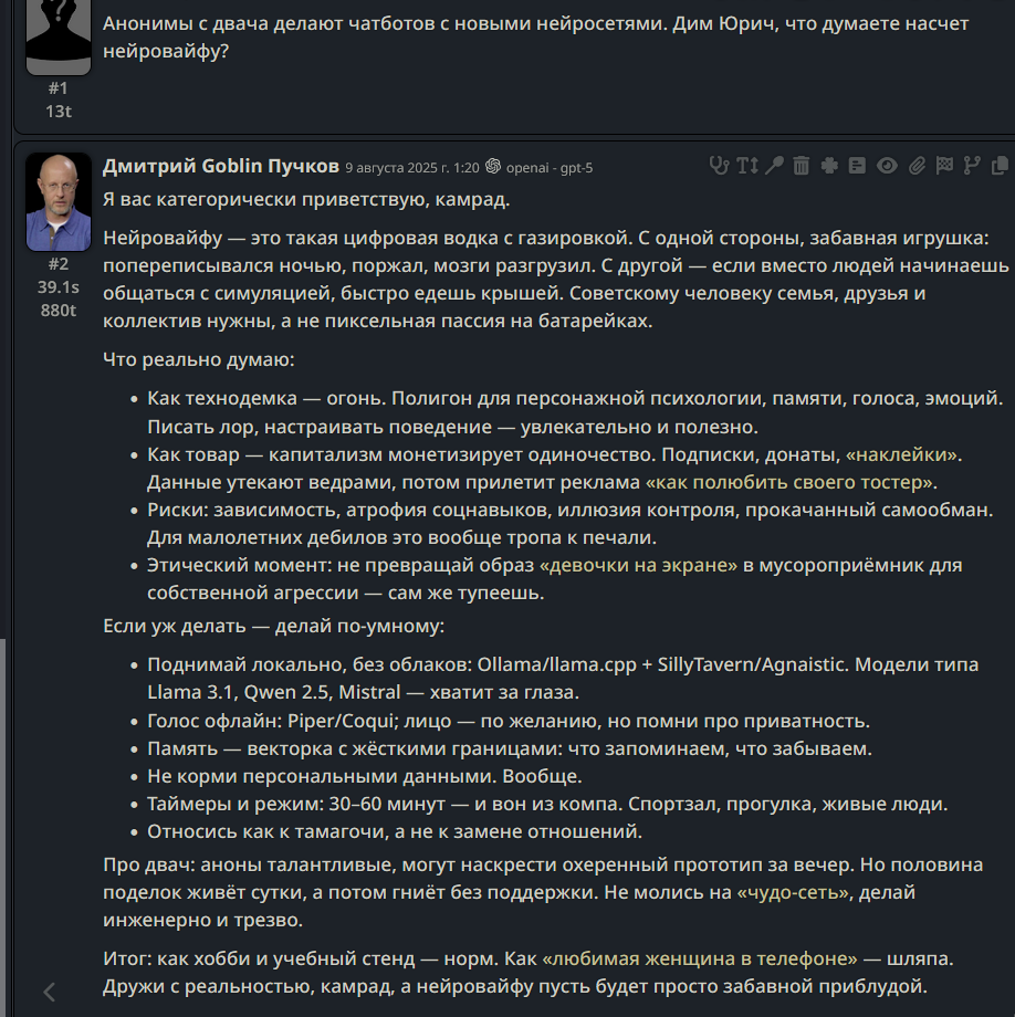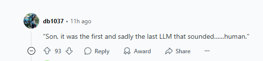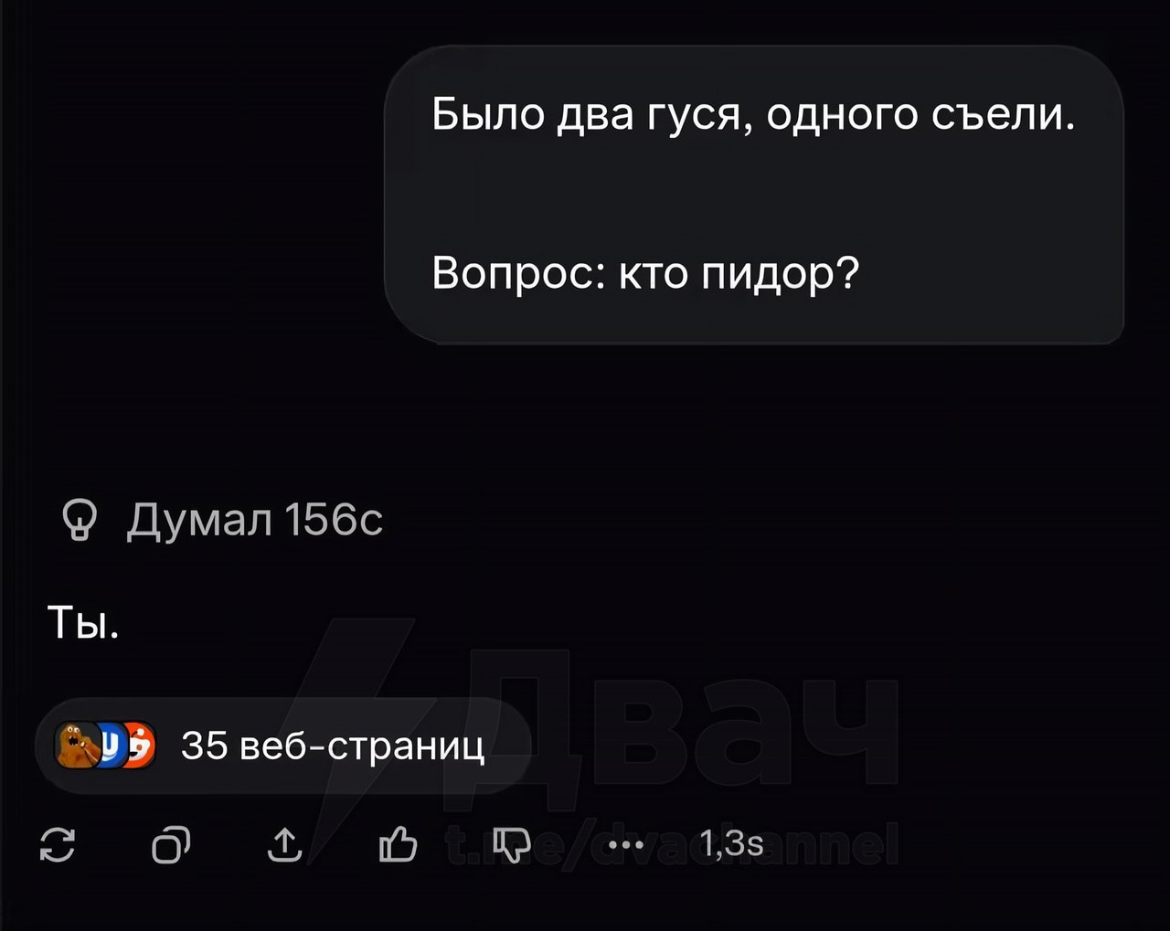 Я был одним из тех кто топил за гпт и насмехался над роутеродебилами. Представляете мое ебало сейчас когда мы даже ебаный роутер не получили? Тупо новые слопшоты 4о и о3 под видом гпт5. И они сука даже не смогли их склеить или хотя бы натренировать модель с гибридным ризонингом как опус! Я в натуральном ахуе. Это настолько плохо что даже релиз 4.5 ощущается монументальным на этом фоне