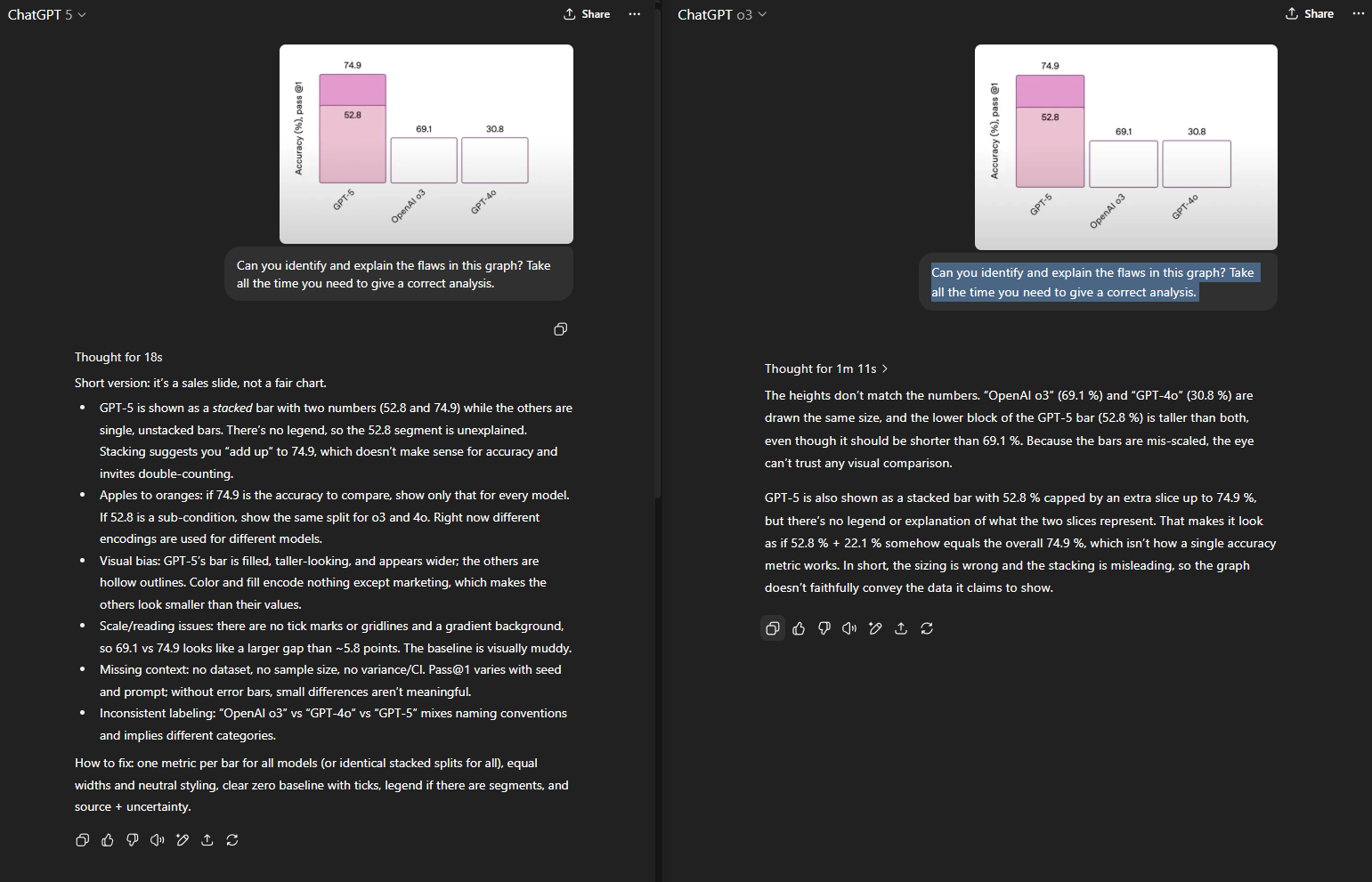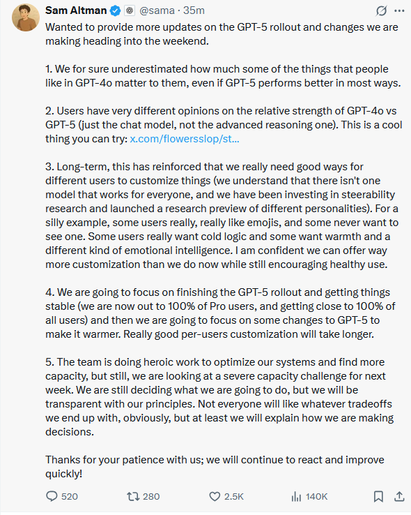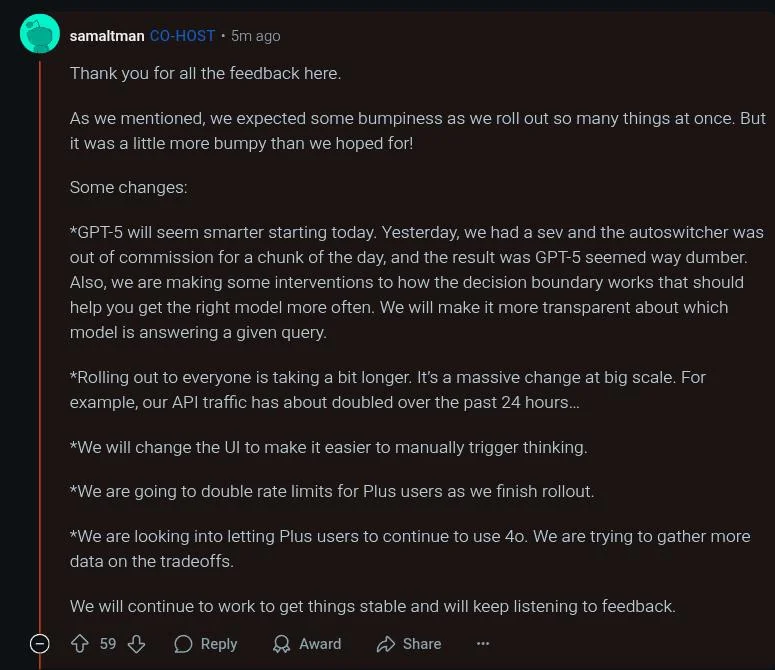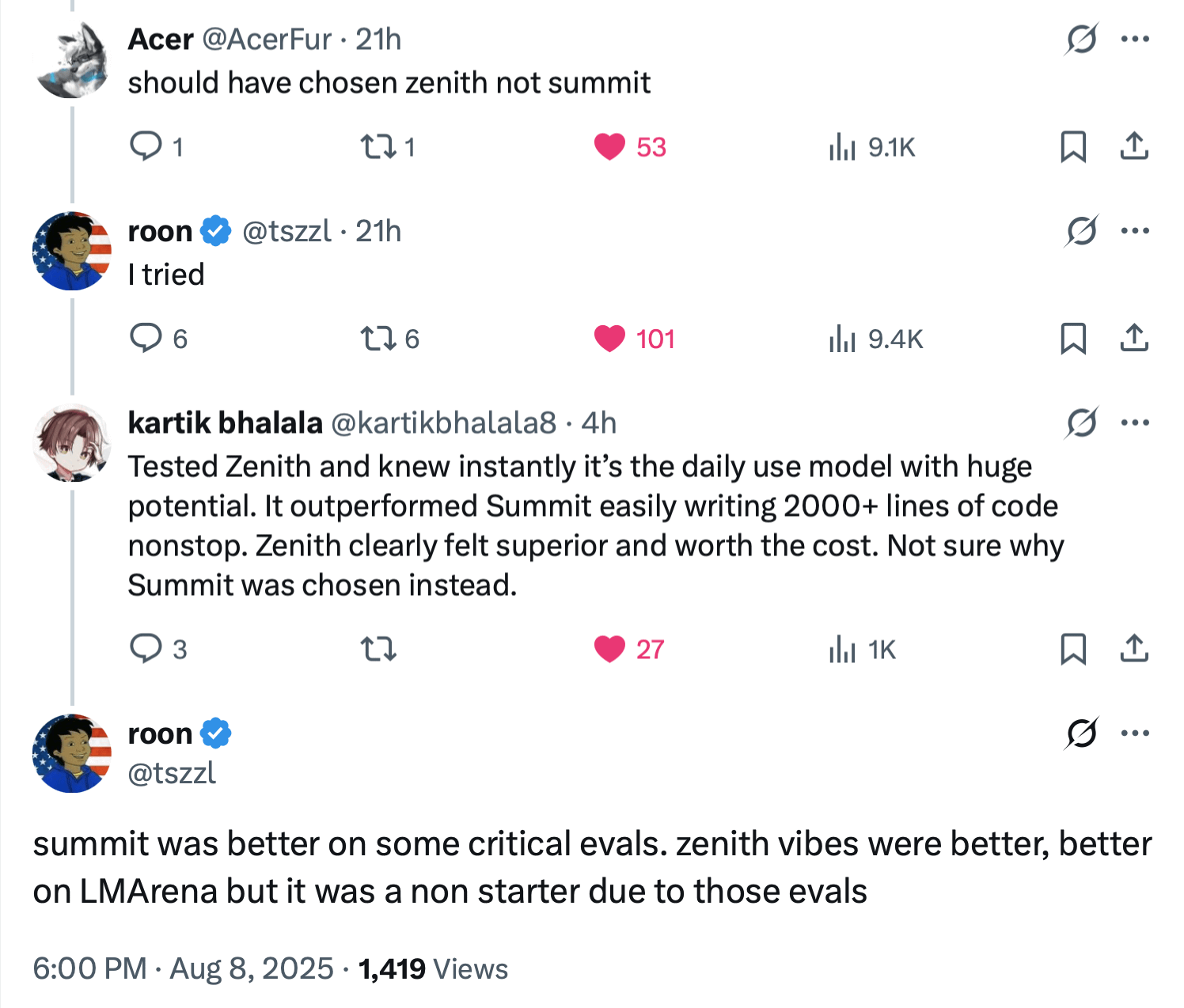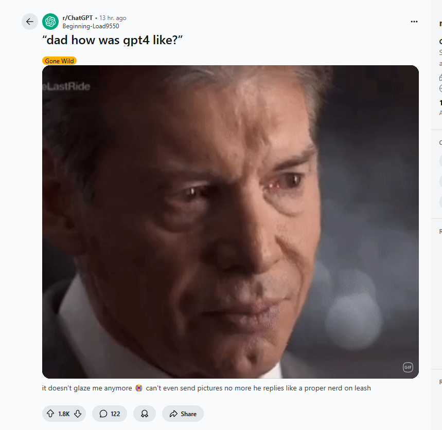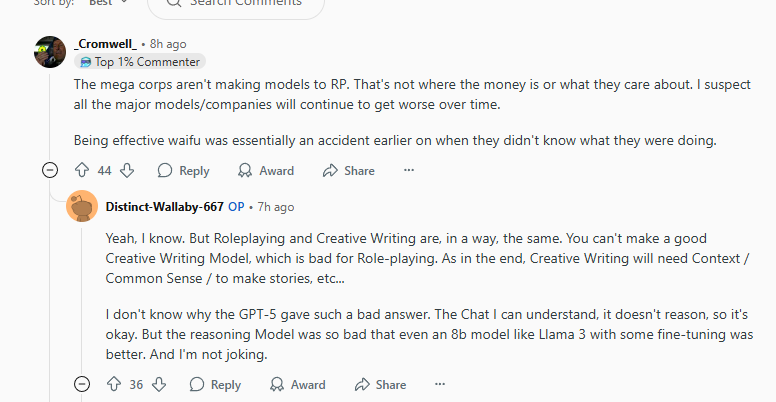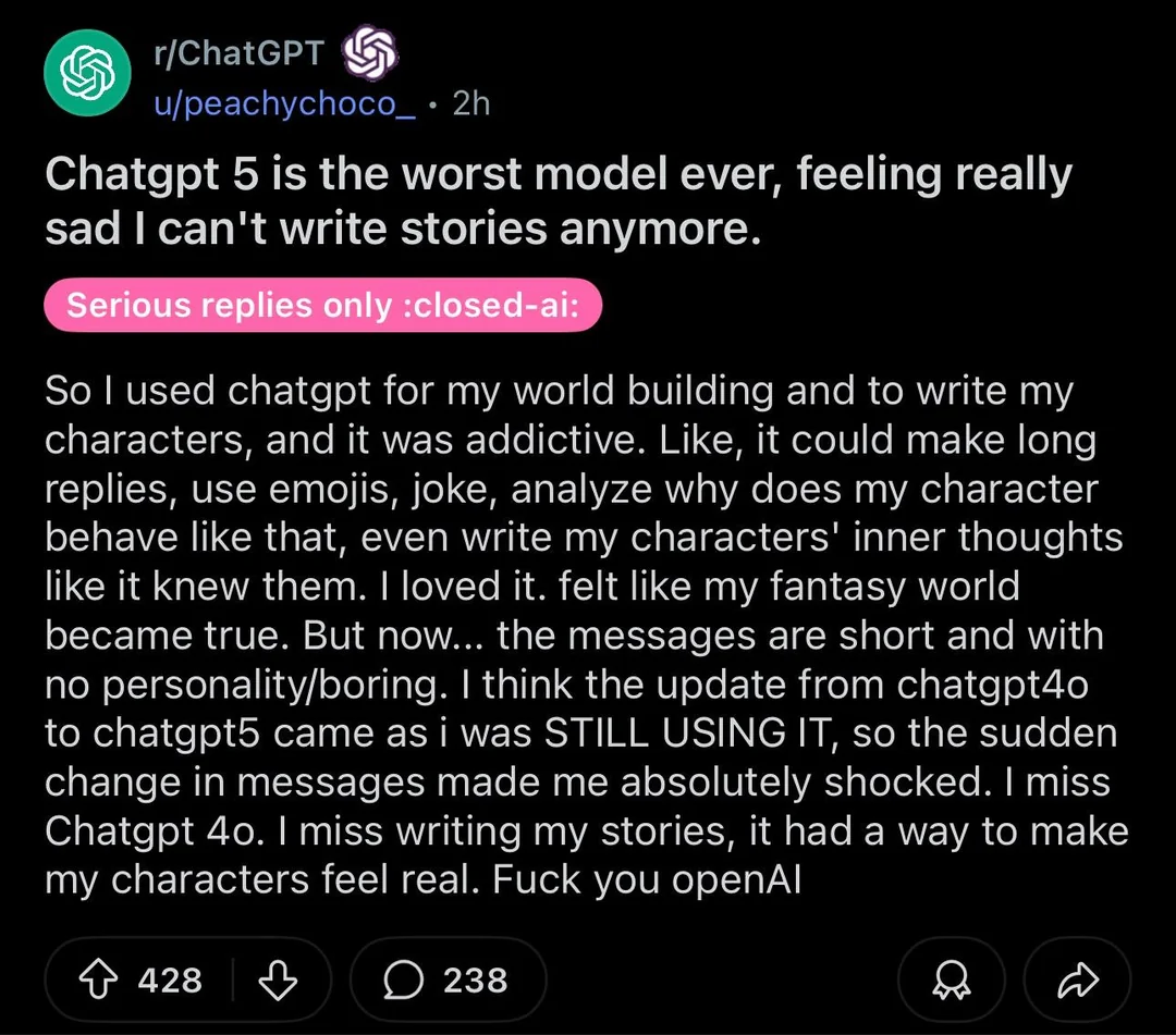 Я был одним из тех кто топил за гпт и насмехался над роутеродебилами. Представляете мое ебало сейчас когда мы даже ебаный роутер не получили? Тупо новые слопшоты 4о и о3 под видом гпт5. И они сука даже не смогли их склеить или хотя бы натренировать модель с гибридным ризонингом как опус! Я в натуральном ахуе. Это настолько плохо что даже релиз 4.5 ощущается монументальным на этом фоне