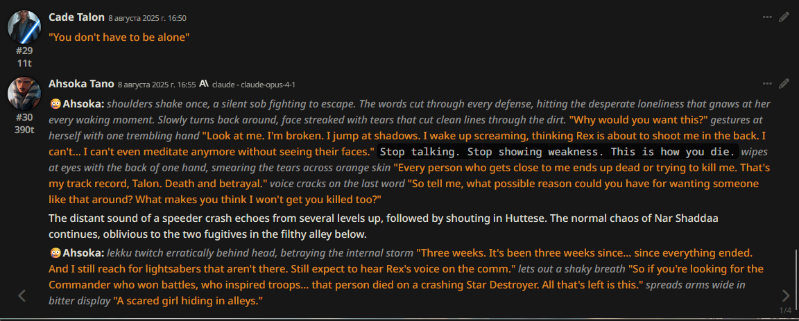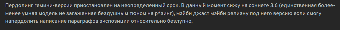 А почему вы тут все обсуждаете какое-то говно? Опус 4.1 при всех его недостатках в настоящий момент недосягаемо далеко как от безмозглых гемини так и от говнопрозовых гпт с сойнетами. Какой смысл вообще сорта говна разбирать? Ну ок да соглашусь что для персоны нужна другая сетка, у меня например Кими стоит но это же мелочь в масштабе контекста и там в основном только качество и отличность прозы решает, ибо большего персоне и не надо. Ну ок там для примеров в кариочку еще р1 используется. Но это как бы все. Для всего остального безальтернативен жопус 41.