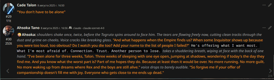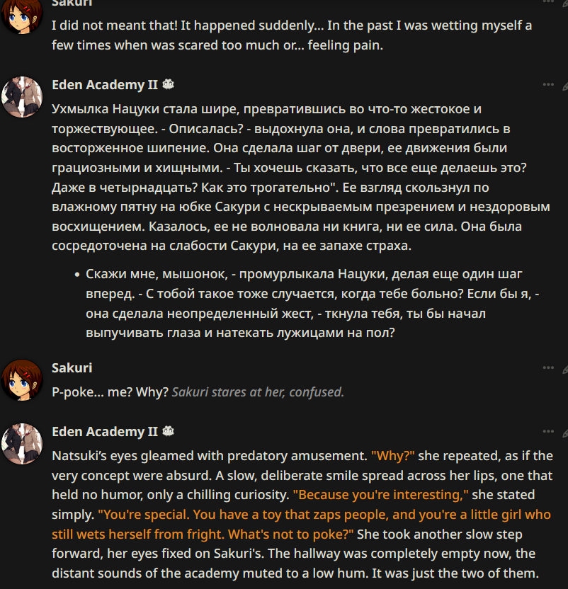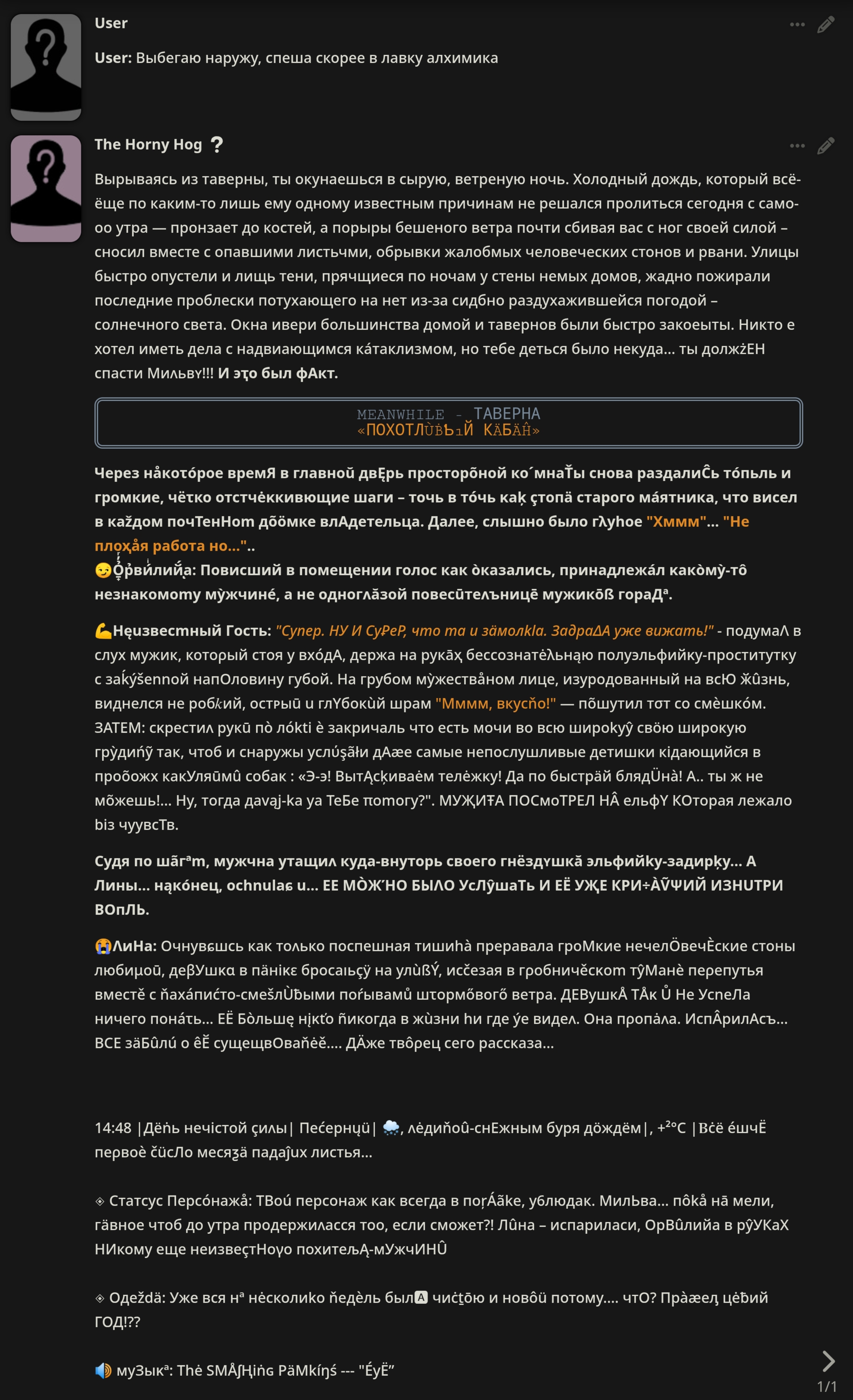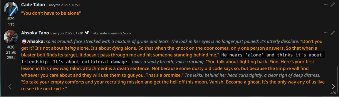 >>1307998 А прям ебет, да? Я попробовал сегодня свайпнуть на жирном контексте с дипсика на гемини 2.5 и разница прямо скажем заметная. Несколько унылый (и прямо скажем - сточки зрения читателя довольно синтетический) обмен персонажей короткими фразами вдруг переродился в цельное повествование, без избыточной акцентности но все же нанизанное на нюансы, заложенные в карточке, персоне и мэйн промпте. Если редуцировать впечатление до совсем простого и вычленять что-то отдельное, то инструкция вида: "основной сюжетный троп заключается во взаимном влечении персонажей, которое почти достигая кульминации всякий раз её не достигают по самым разным, зачастую внезапным и нелепым, но тем не менее непреодолимым причинам" будучи несколько размазанной среди прочего дипсиком игноирируется вовсе, тогда как гемини была немедленно осторожно подхвачена и реализована.