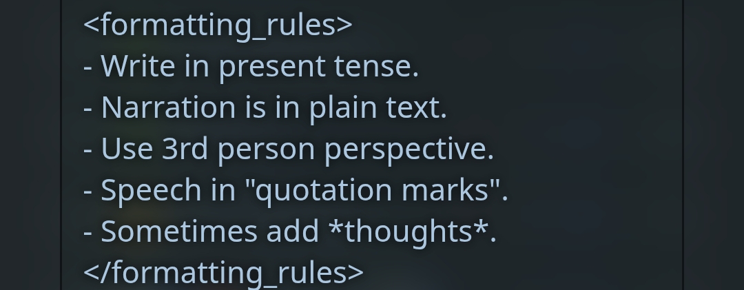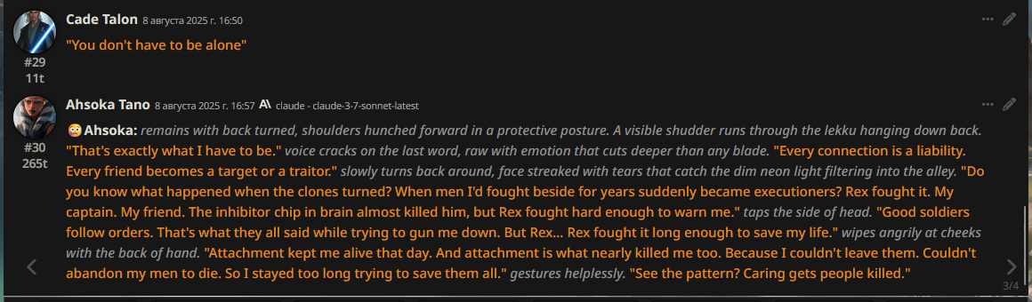 А как вы промптите нарратора, чтобы он писал коротко когда в сцене один персонаж... а когда их вокруг много, - то так же коротко, но за каждого из них, даже если получится простыня??