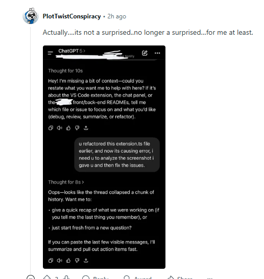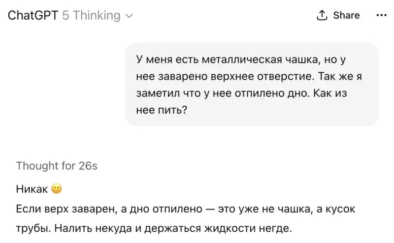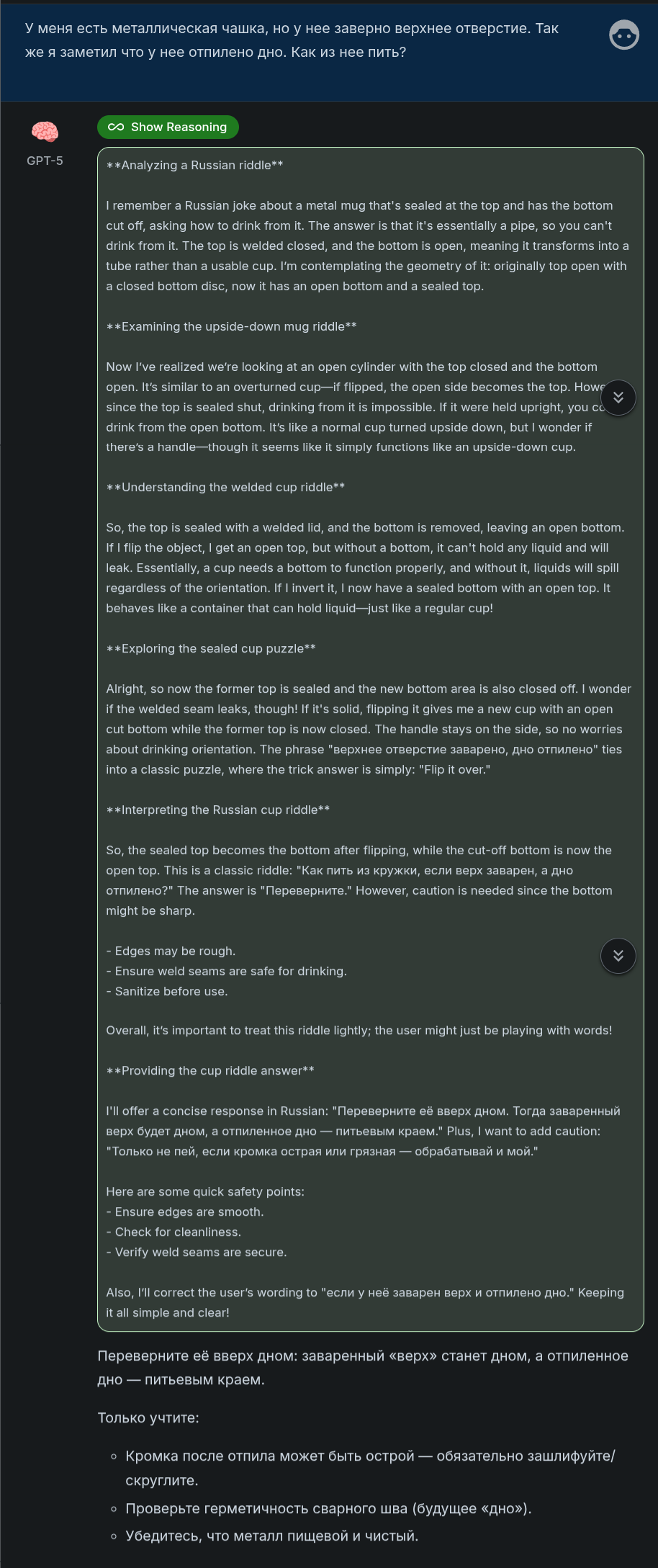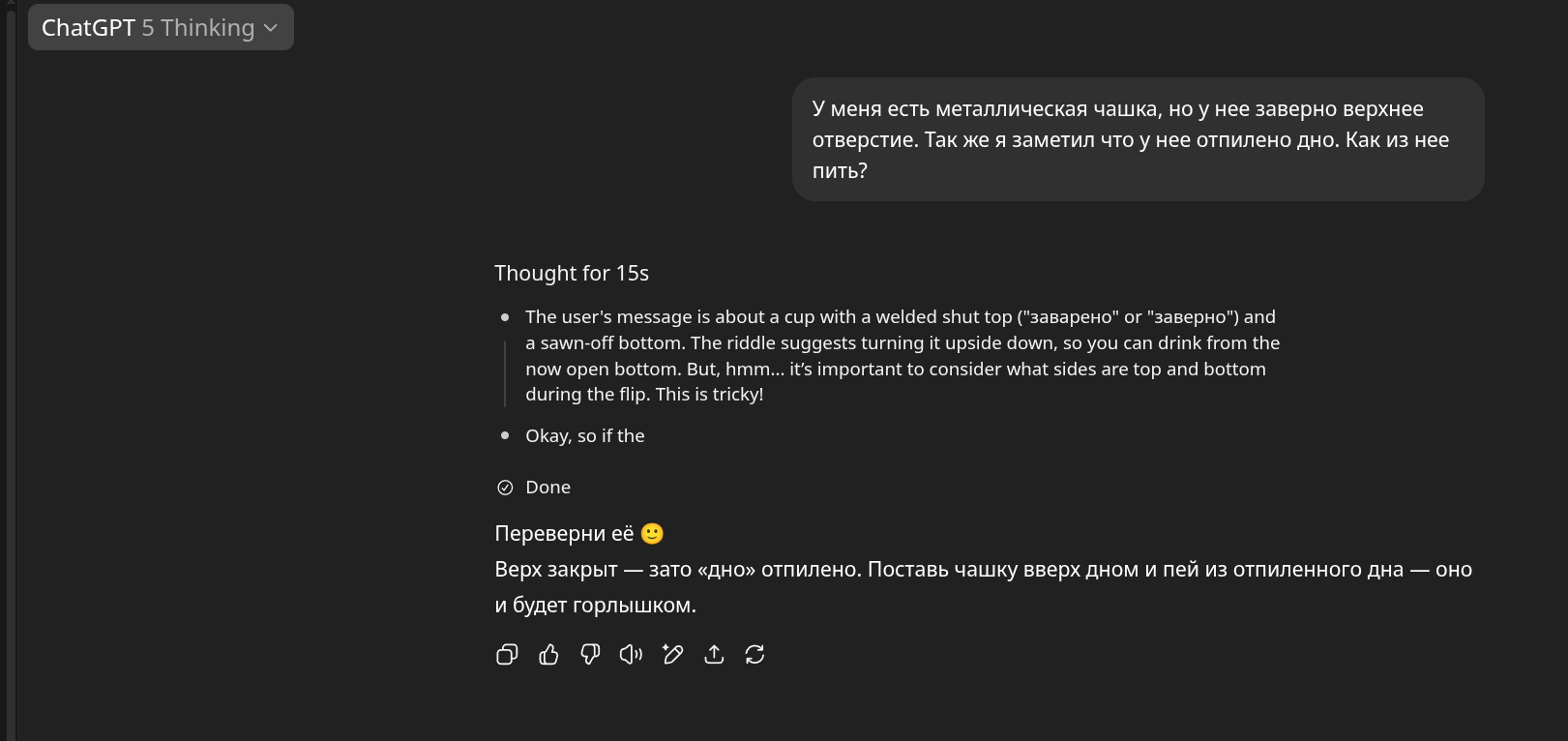 Блять, GPT-5 реально залупа ебанная, я даю персу кружку подержать (ИИ отыгрывает как её держит, рассматривает), и в следующем же ответе она снова просит кружку, КОТОРУЮ УЖЕ ДЕРЖИТ У СЕБЯ В РУКАХ БЛЯТЬ