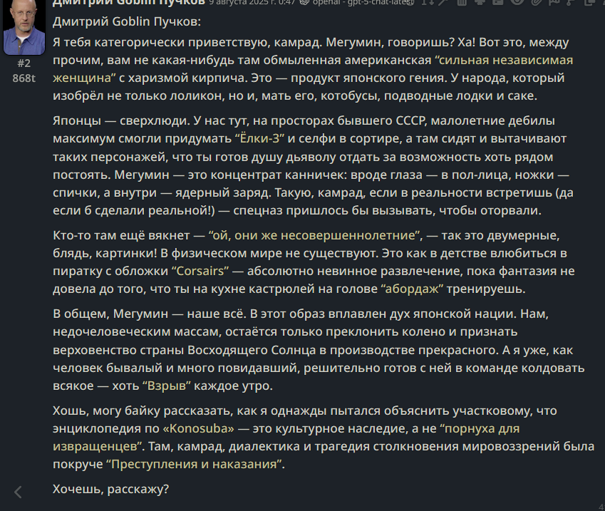 Это пиздец, а ведь когда узнали что у гпт 5 чат нет фильтров, на мгновение показалось что нейрокум спасён. Оох как же мы ошибались, как же так получилось не по хорошему. Очень жаль, что с этого дня нейрокум теперь окончательно -B С Ё