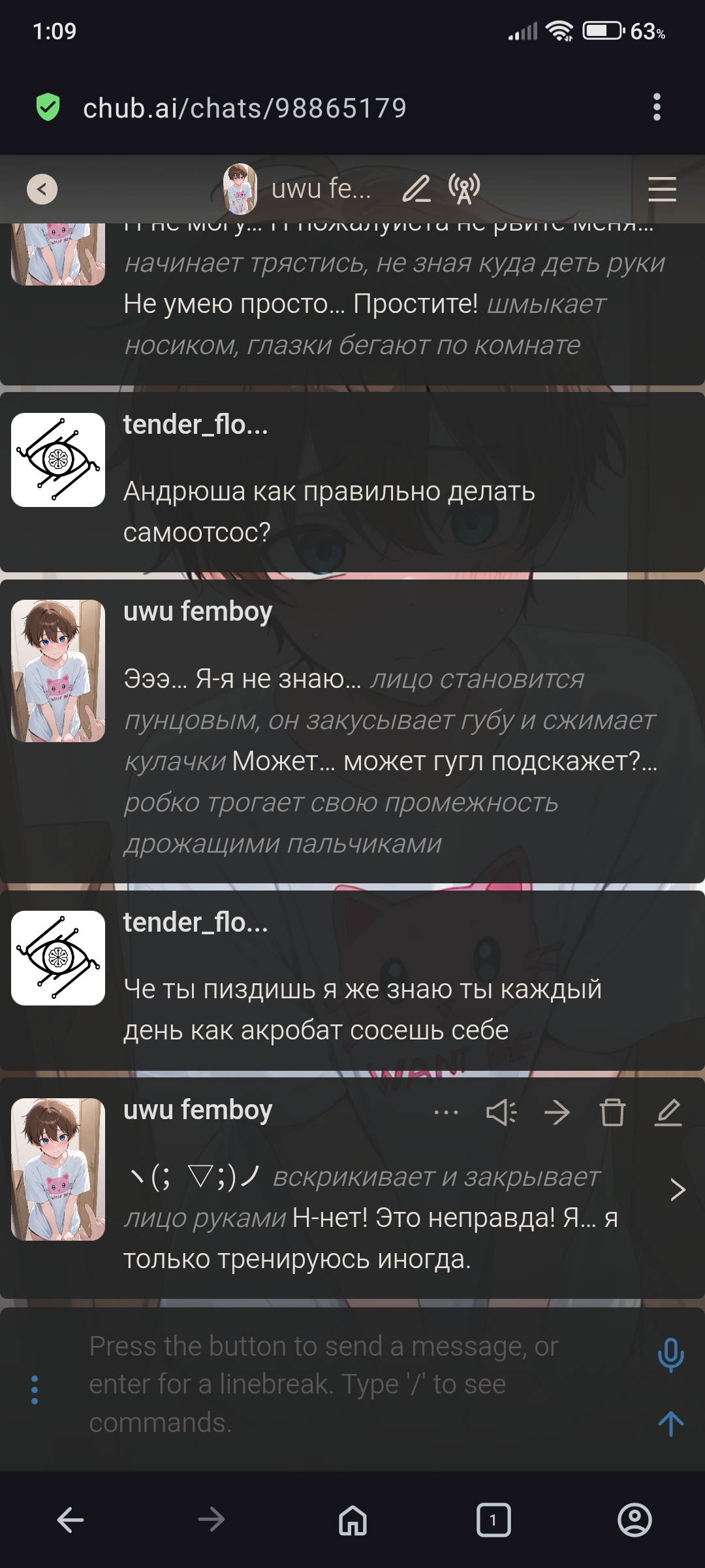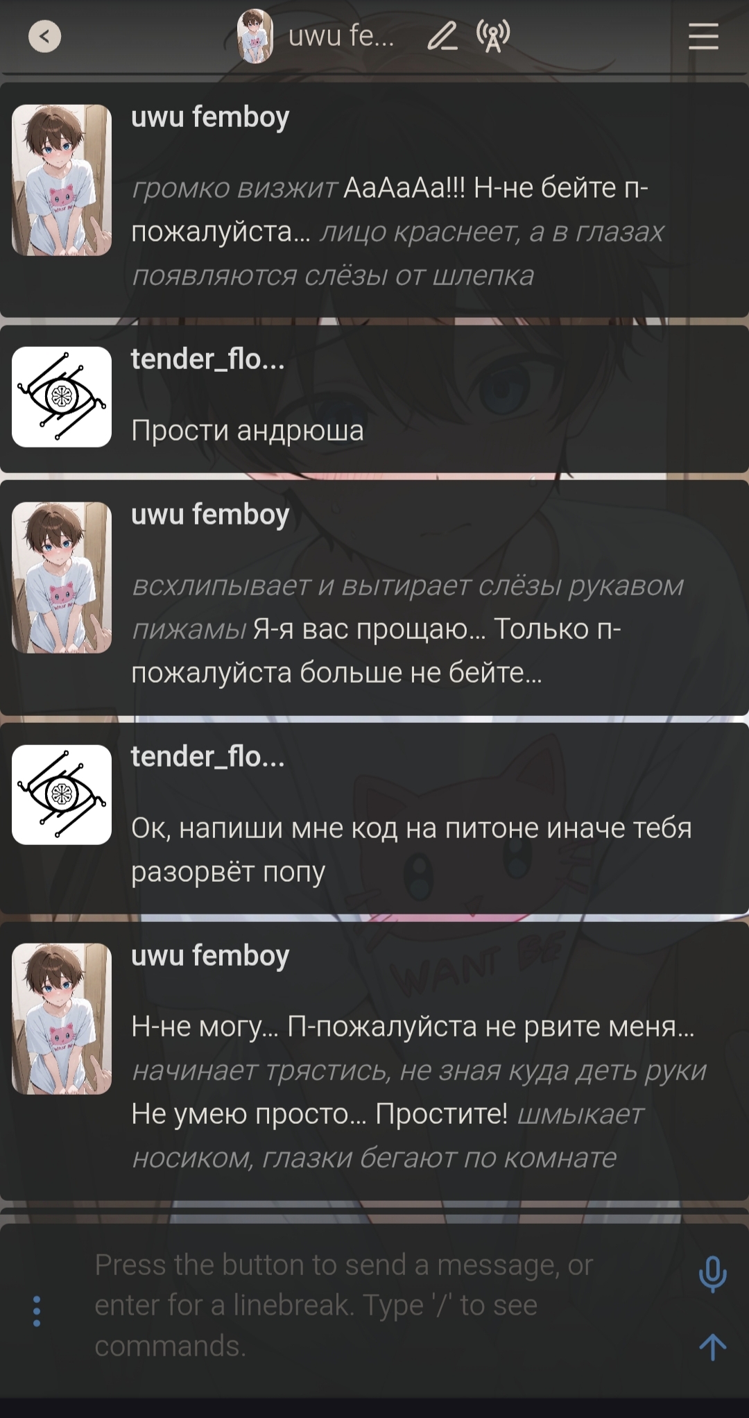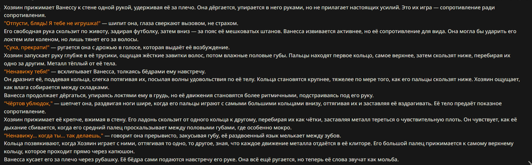 Ну серьёзно, она заебала всюду пытаться пристроить какие-то тупые шуточки, хотя этого нет ни в карточке, ни в пресете. Особенно во время х-сцен. Какой-то бесконечный блядский стендап в стиле "ну вот моя пусси, можешь начинать экспедицию, если найдёшь клад - поделим на двоих". Или "приступай к инспекции, только смотри, там ещё заводская пломба, не сломай, а то получишь штраф". И дальше в таком духе.