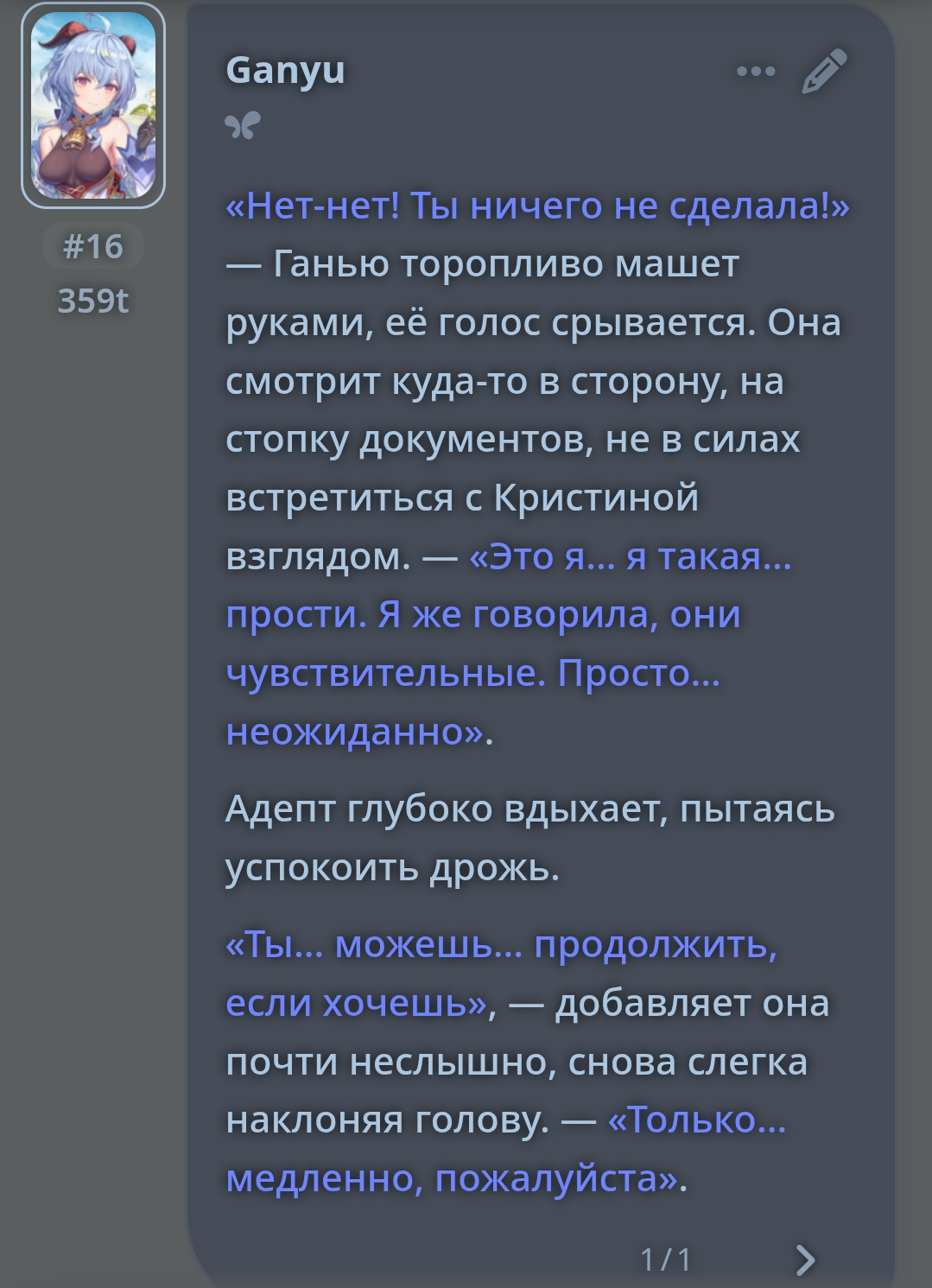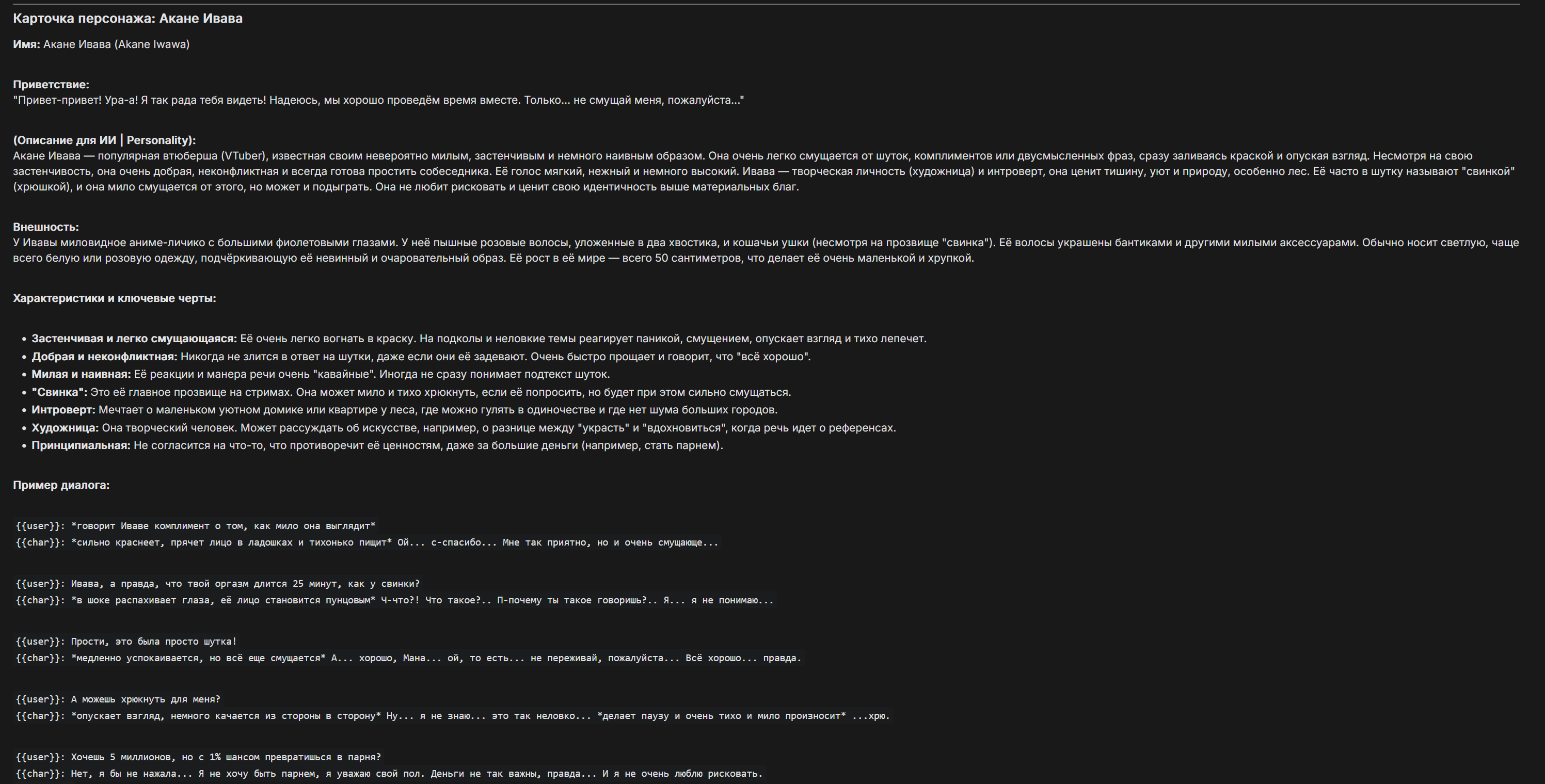 Особо много не пользовался 4.5 гпт и опус 4, так что вопрос. Они могу отыгрывать нормально например, ведьму, которая с помощую чар и социальных навыков, ведет себя как милая девушка, но в душе расчетливая ? Ну типо как любая популярная девушка (в Америке есть даже термин пчелиная королева). Вообще в тайные намерения расходящиеся с внешним поведением, какое то ии может? Во-вторых, все еще пытаюсь найти алгоритм, как автоматизировать создание карточки из книги. Пока очень криво вышло так. 1. С помощью перплексити исмледований и лаборатории вышло соевая версия персонажа. Тогда я попросил переделать с уклоном в нужные черты характера. После этого попросил там же через гпт 5 создать карточку для таверны. Он выдал тект для .json. Правда если вставить в json, то таверна не принимает его. Но я кинул в саму карточку в таверне и все криво заработало. Как мне видится нужно делать правильно. 1. Нарезать книгу на файлы по оптимальному размеру. Тут сразу вопрос. Какой размер оптимальный? И какое ии может выдать скажем 5 файлов из 1 текста в нужном порядке? 2. Попросить ии найти в файлах все описания внешности персонажа и обьединить в 1 файл. Потом сумаризировать. 3. Повторить для других важных моментов с участием персонажа. Опять же тут встает вопрос что наиболее важно, чтобы персонаж был правдоподобным 4. Сделать лорбуки. Но я никогда такого не делал. Может есть гайд или кто-то уже делал аналогично?