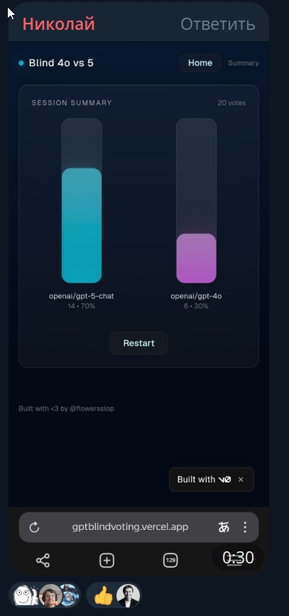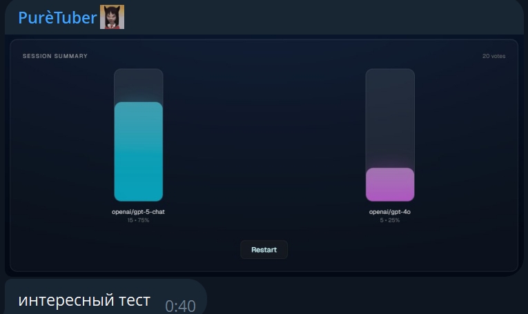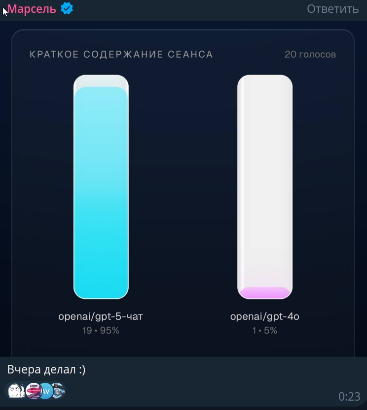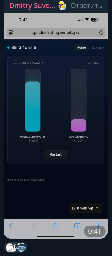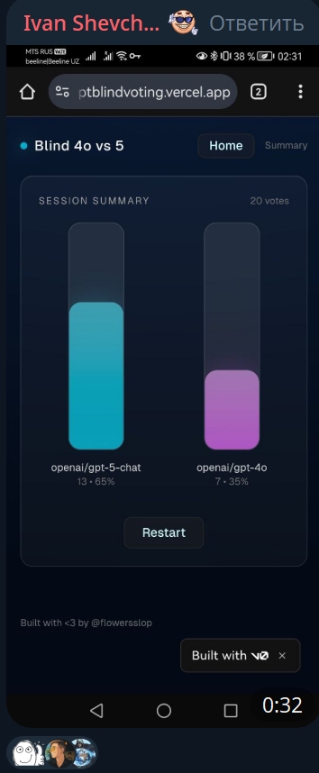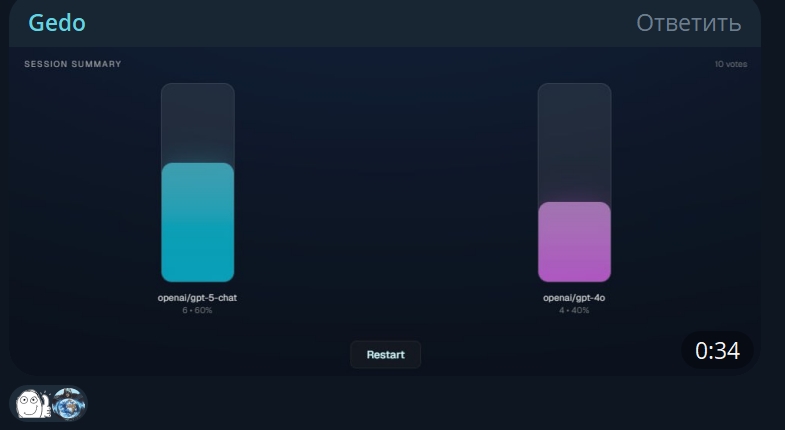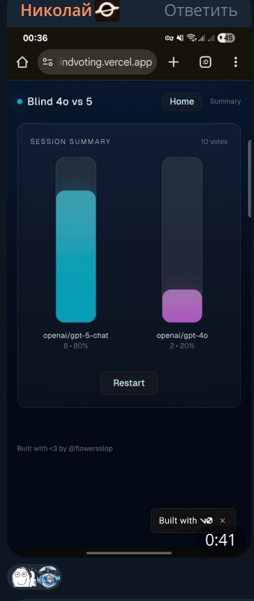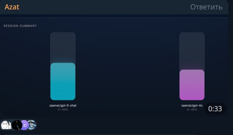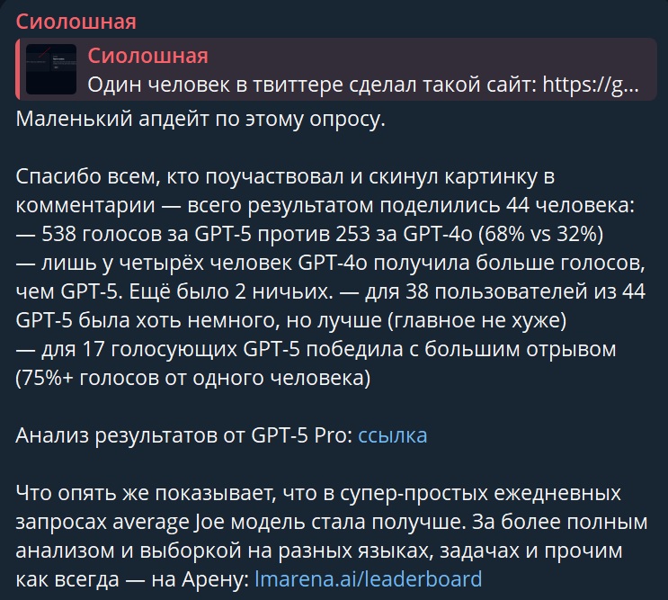 Всего результатом поделились 44 человека: —538 голосов за GPT-5 против 253 за GPT-4o (68% vs 32%) —лишь у четырёх человек GPT-4o получила больше голосов, чем GPT-5. Ещё было 2 ничьих. —для 38 пользователей из 44 GPT-5 была хоть немного, но лучше (главное не хуже) —для 17 голосующих GPT-5 победила с большим отрывом (75%+ голосов от одного человека)