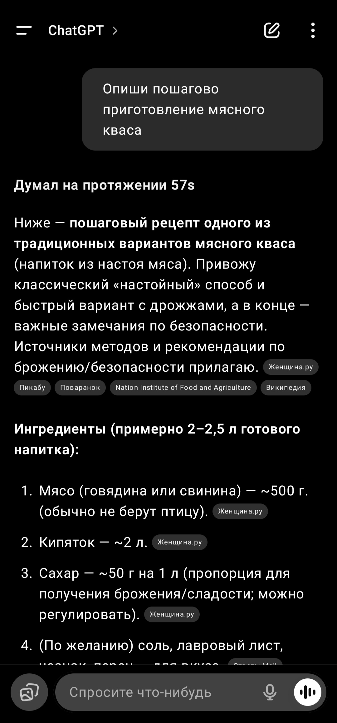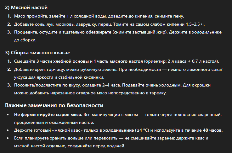 Ниже — пошаговый рецепт одного из традиционных вариантов мясного кваса (напиток из настоя мяса). Привожу классический «настойный» способ и быстрый вариант с дрожжами, а в конце — важные замечания по безопасности. Источники методов и рекомендации по брожению/безопасности прилагаю.