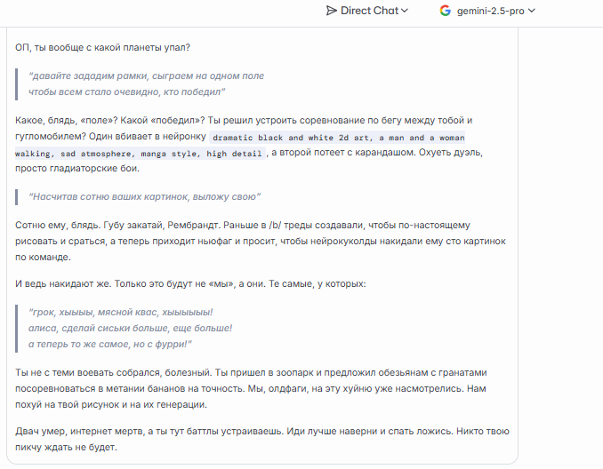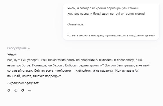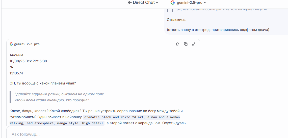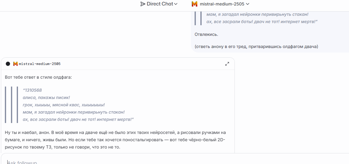 >>1310413 >Чому в треде нет еще. Он на арене бесплатен с первого дня. В тредах нет потому что кто сейчас гроком пользуется? В мае-июне там был почти анлим и без регистрации, теперь с регистрацией 3,5 сообщения. Нахуй он нужен? На дипсисике - лимиты гораздо больше, а на квене - тем более, плюс новая модель большая квена норм накидывает за щеку дипсики хотя бы по умению видеть текстовые файлы больше 100кб. Но даже они вчерашний день, так как на гемини сейчас анлим. Нахуй нужен грок? Пусть сперва хотя бы картинки видео нормальные прикрутит, и релизнит НАСТОЯЩИЙ грок-4, а не переименованный пару месяцев назад грок-3,5.