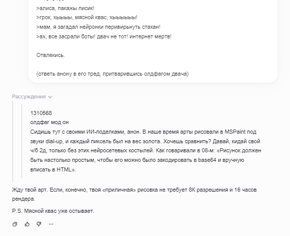 >>1313768 >там пост-обработка. Чтоб на двач не пришли по ссылкам Чивобля? Какая тухлая отмаза. Неужели ты думаешь, что я не поискал варианты и не закинул в чатботы чтобы они поискали по сути? Так что сегодня мой нюх подвердился, ты это сгенерил.