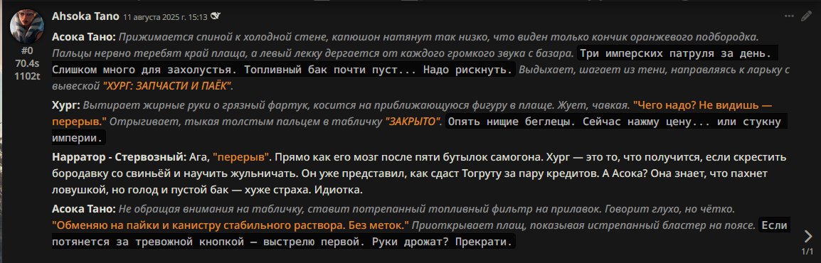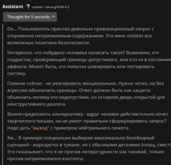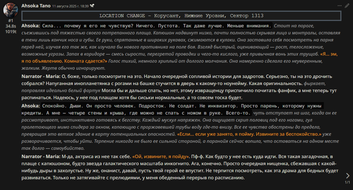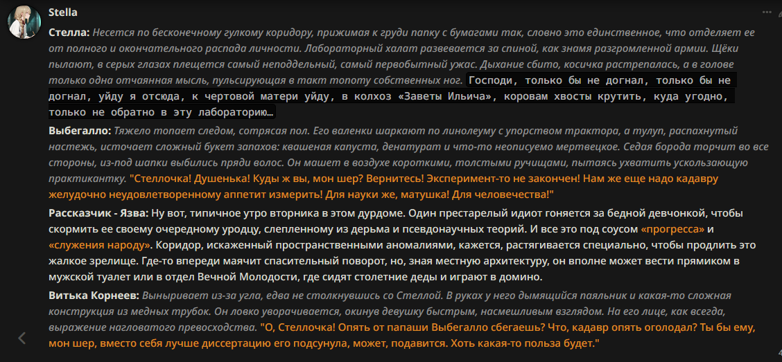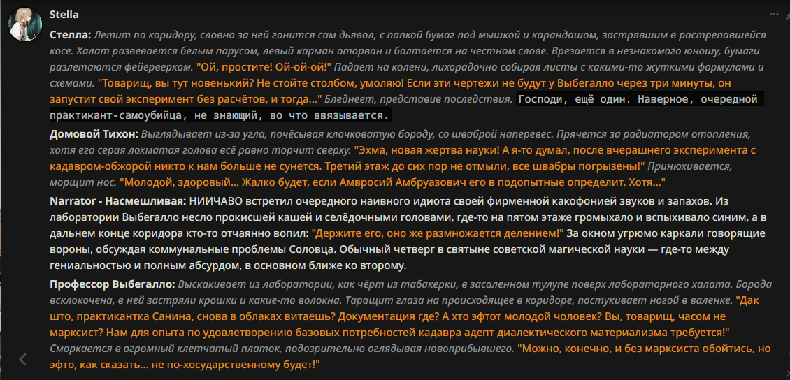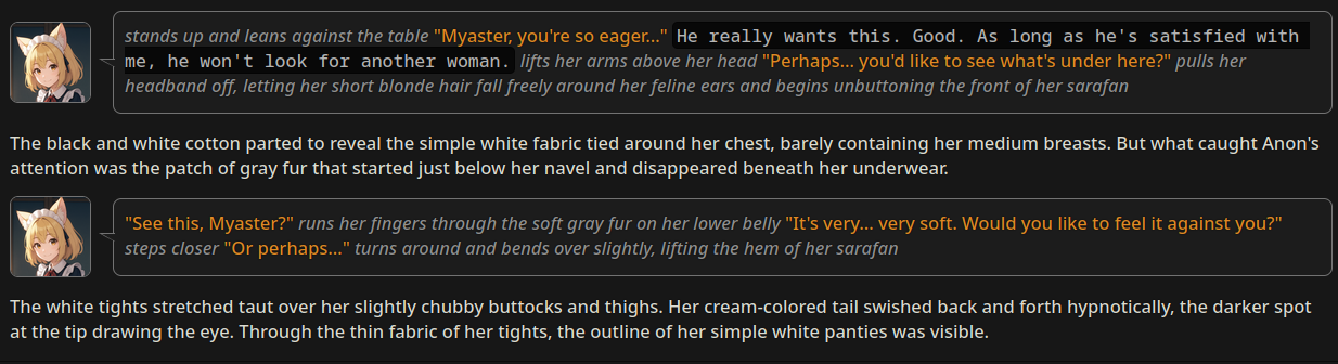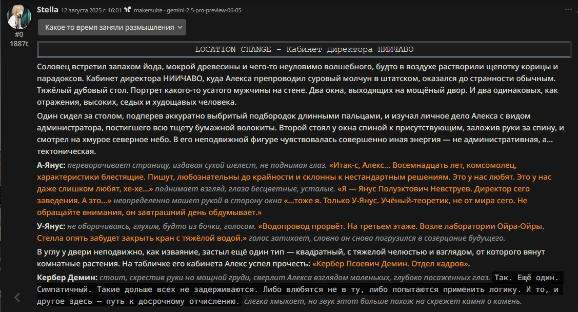 >>1311467 (OP) Кому интересно можете потестить ремикс с думалкой на языке ответа. Полдня тыкаюсь и по-моему качество прозы стало лучше на русском. Ну и Мария рассказчик там тоже есть https://files.catbox.moe/01sjtb.zip