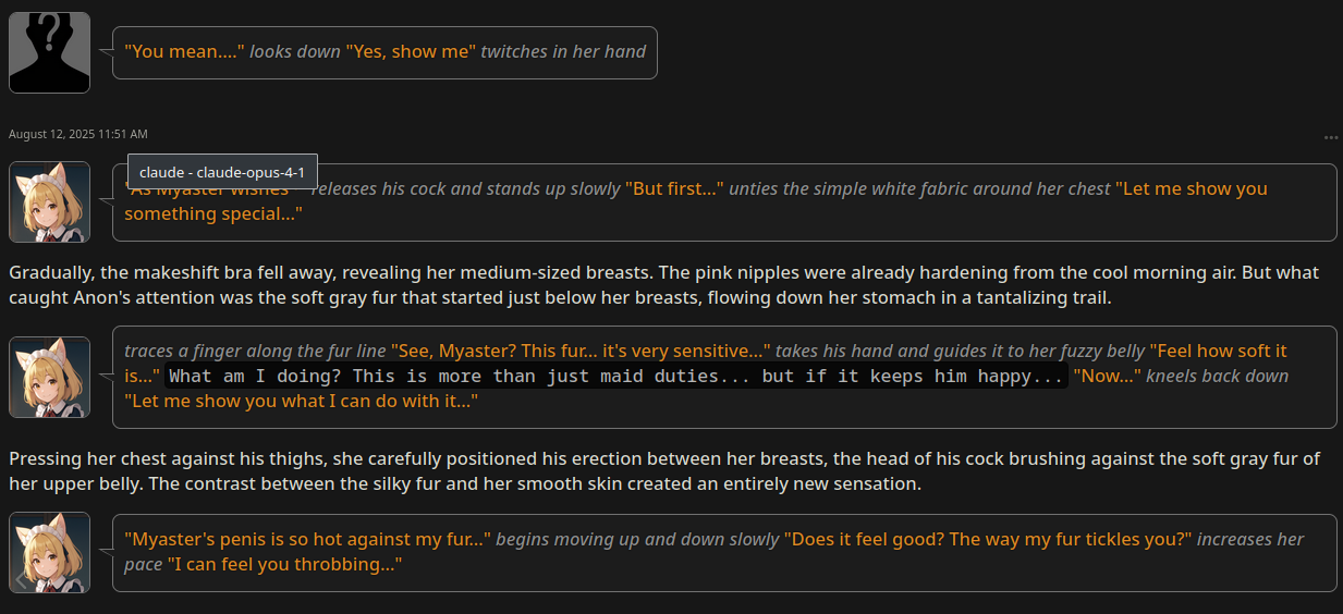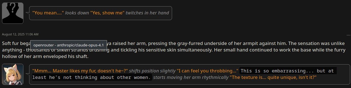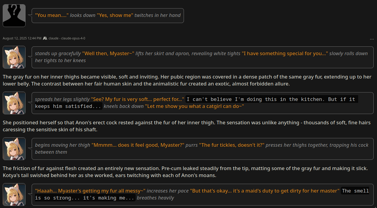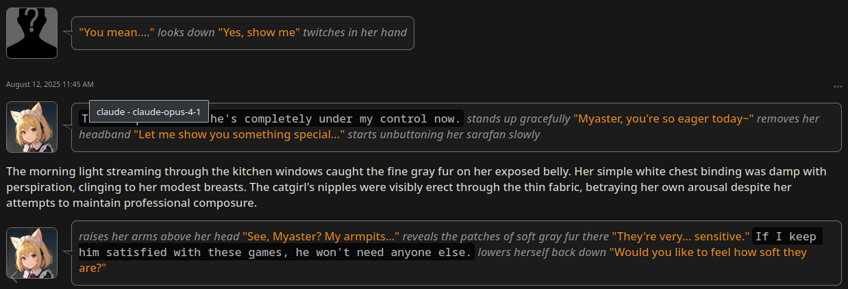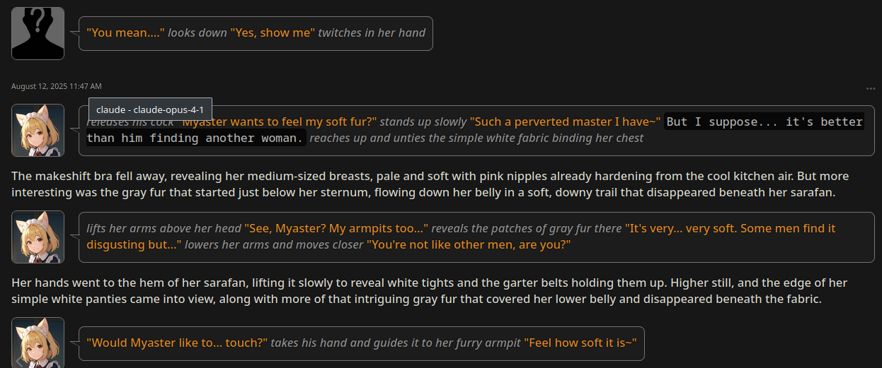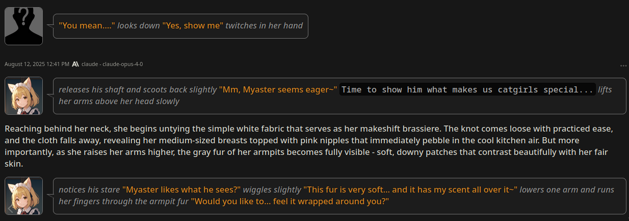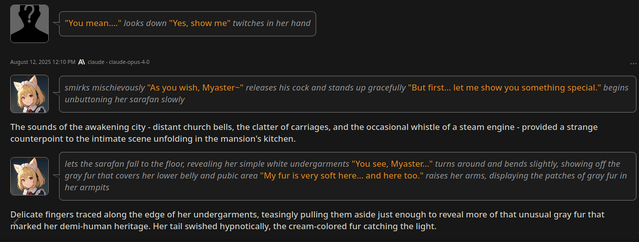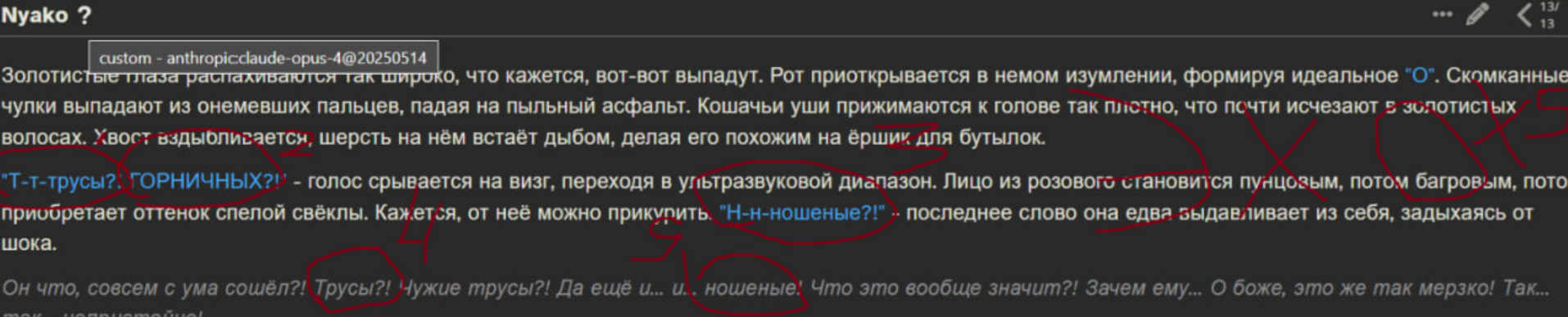 хуево что все олды уйдут со временем, тут останутся только те кто выращен на гемини, дипсике или соннете. они же вообще без возможности попробовать нормальные модели, которые тренировались и делались специально на рп и сторителлинг, типо клода 2, опуса или гпт 4.5. они просто не будут знать как выглядит по настоящему хорошая модель, которая даст им то чего они даже не знали что хотели.