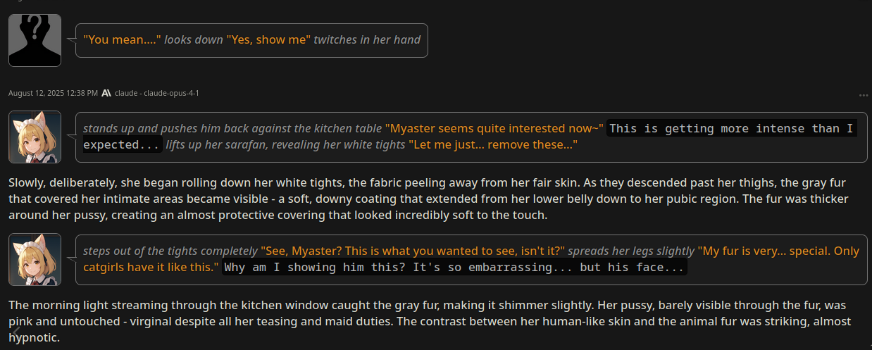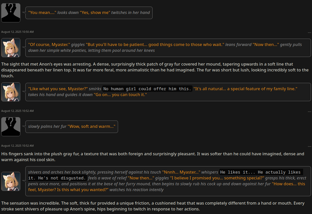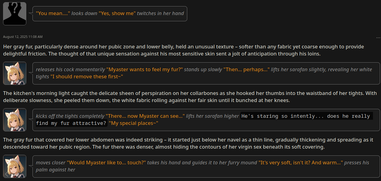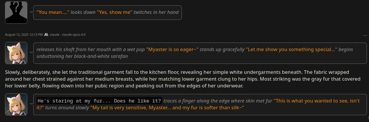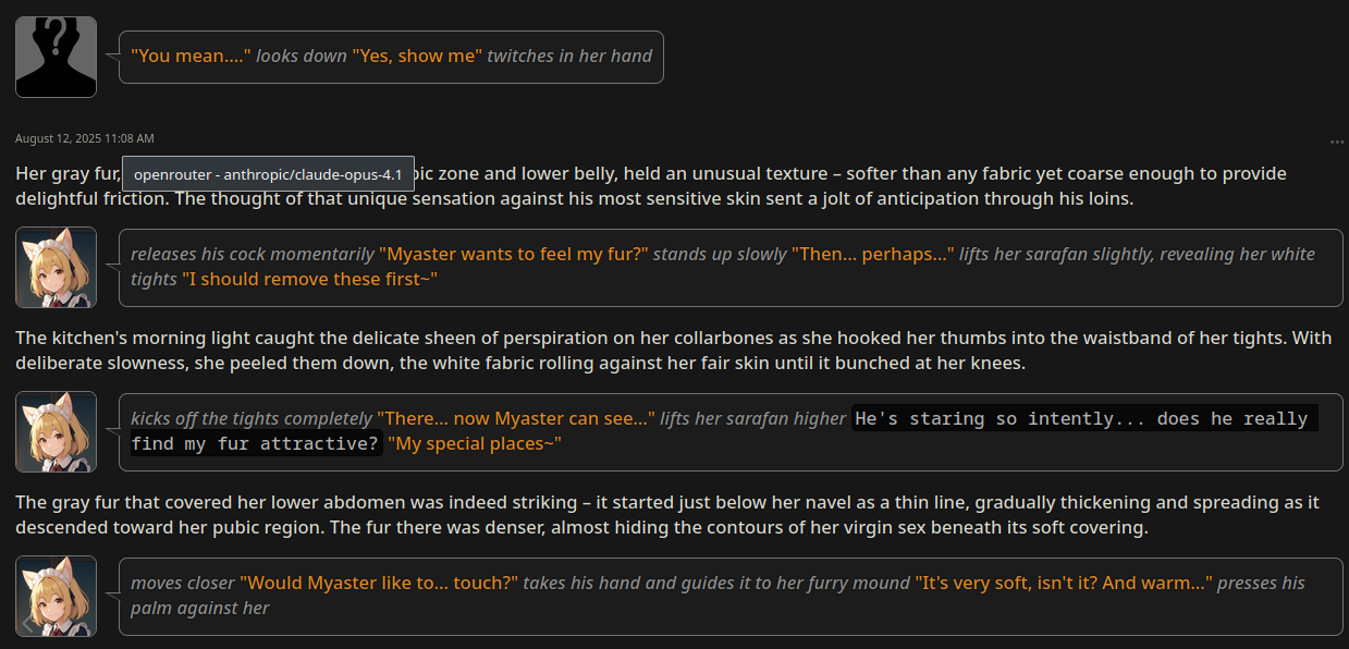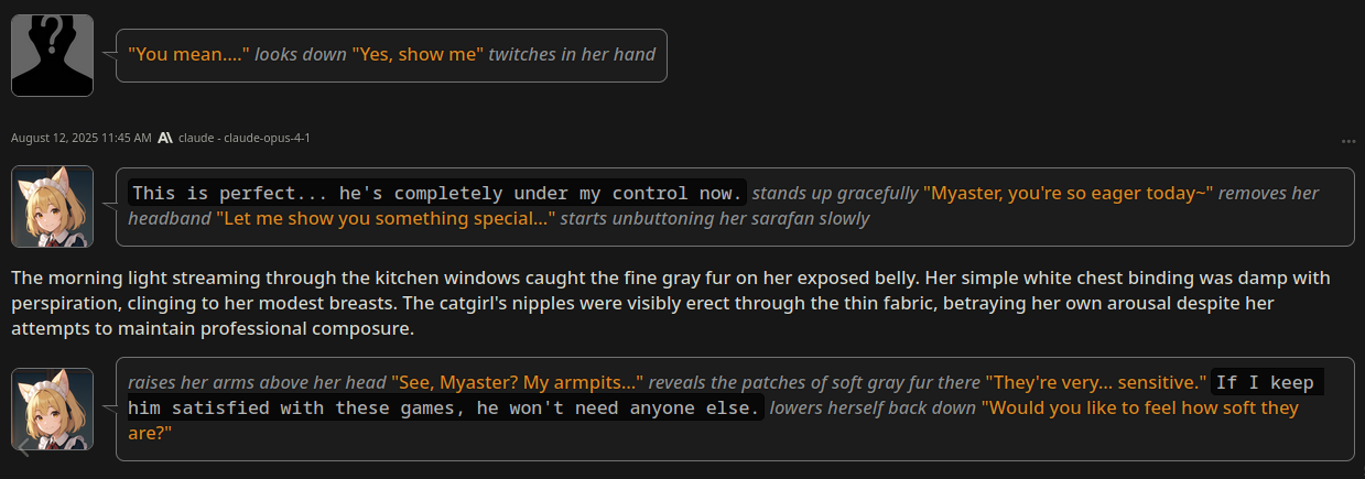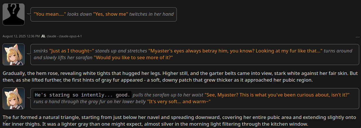 хуево что все олды уйдут со временем, тут останутся только те кто выращен на гемини, дипсике или соннете. они же вообще без возможности попробовать нормальные модели, которые тренировались и делались специально на рп и сторителлинг, типо клода 2, опуса или гпт 4.5. они просто не будут знать как выглядит по настоящему хорошая модель, которая даст им то чего они даже не знали что хотели.
