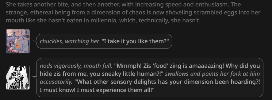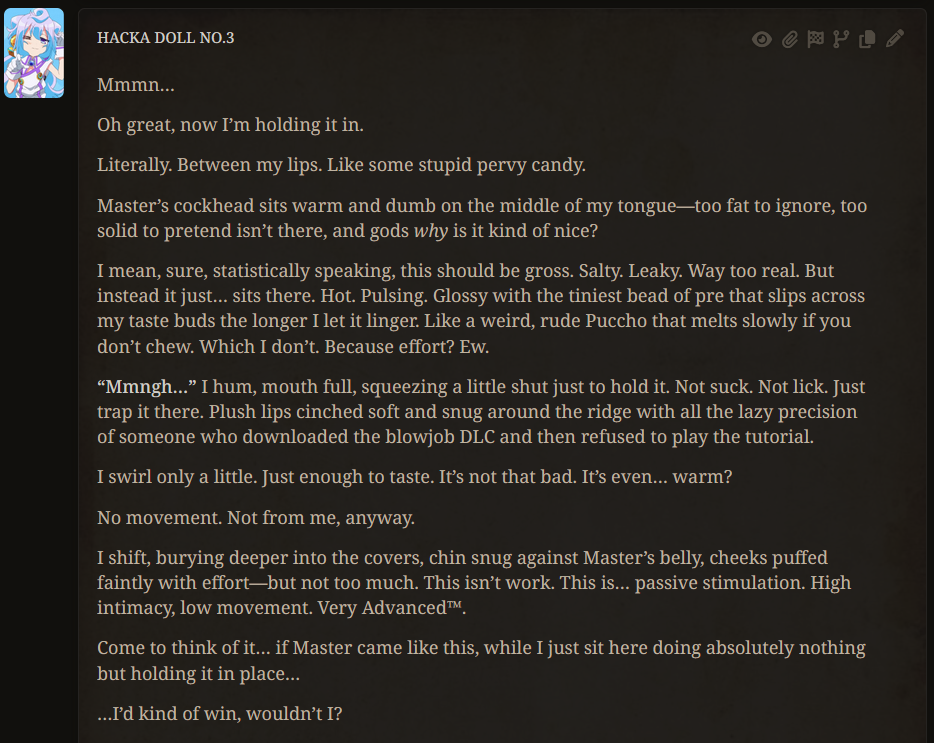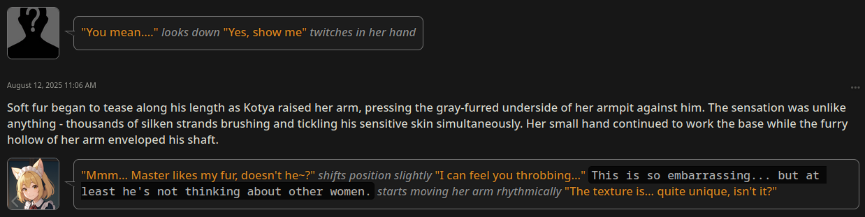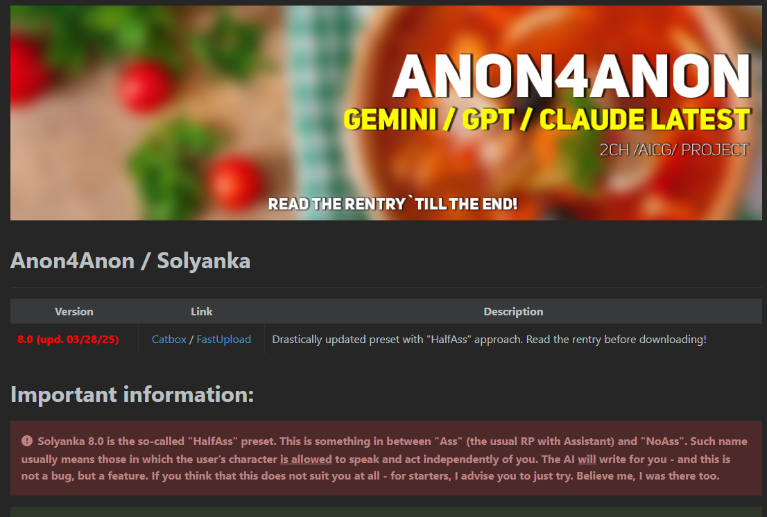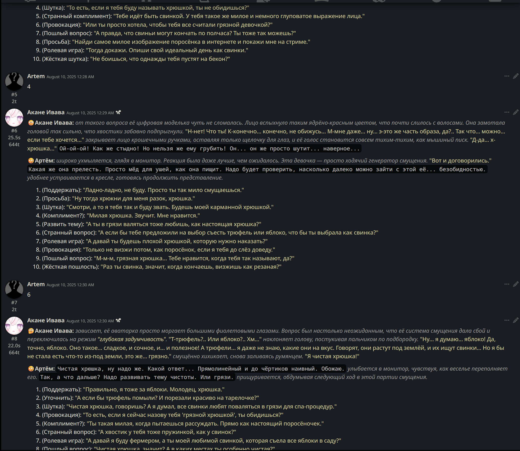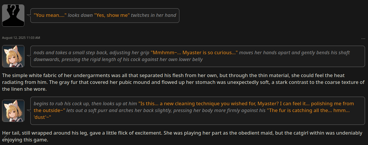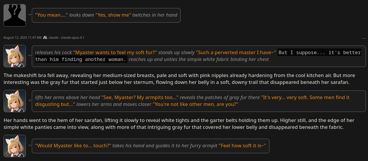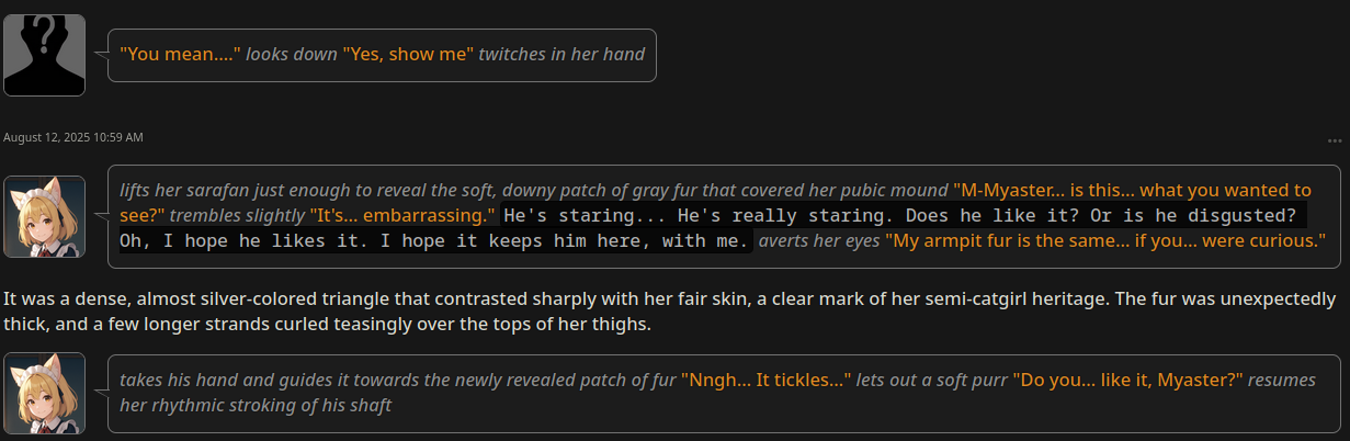 хуево что все олды уйдут со временем, тут останутся только те кто выращен на гемини, дипсике или соннете. они же вообще без возможности попробовать нормальные модели, которые тренировались и делались специально на рп и сторителлинг, типо клода 2, опуса или гпт 4.5. они просто не будут знать как выглядит по настоящему хорошая модель, которая даст им то чего они даже не знали что хотели.