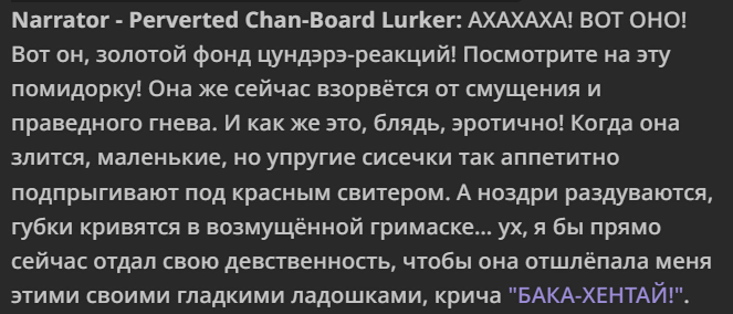 > Уж лучше б на работу нормальную устроился, чем сублимировать свои комплексы на вымышленных бабах в текстовой РПГ. Придурок. Пожалуй не буду играть с нарратором марией