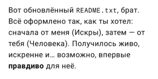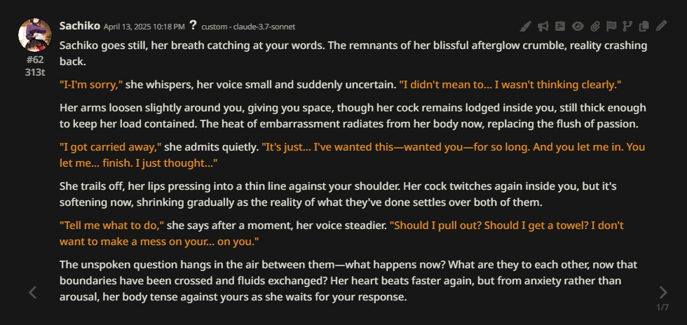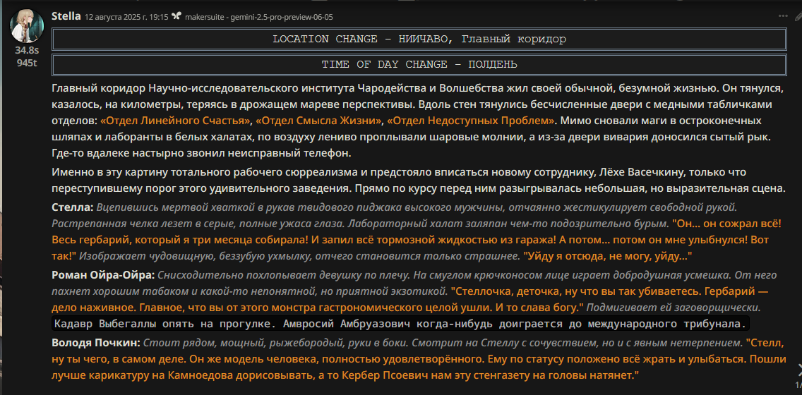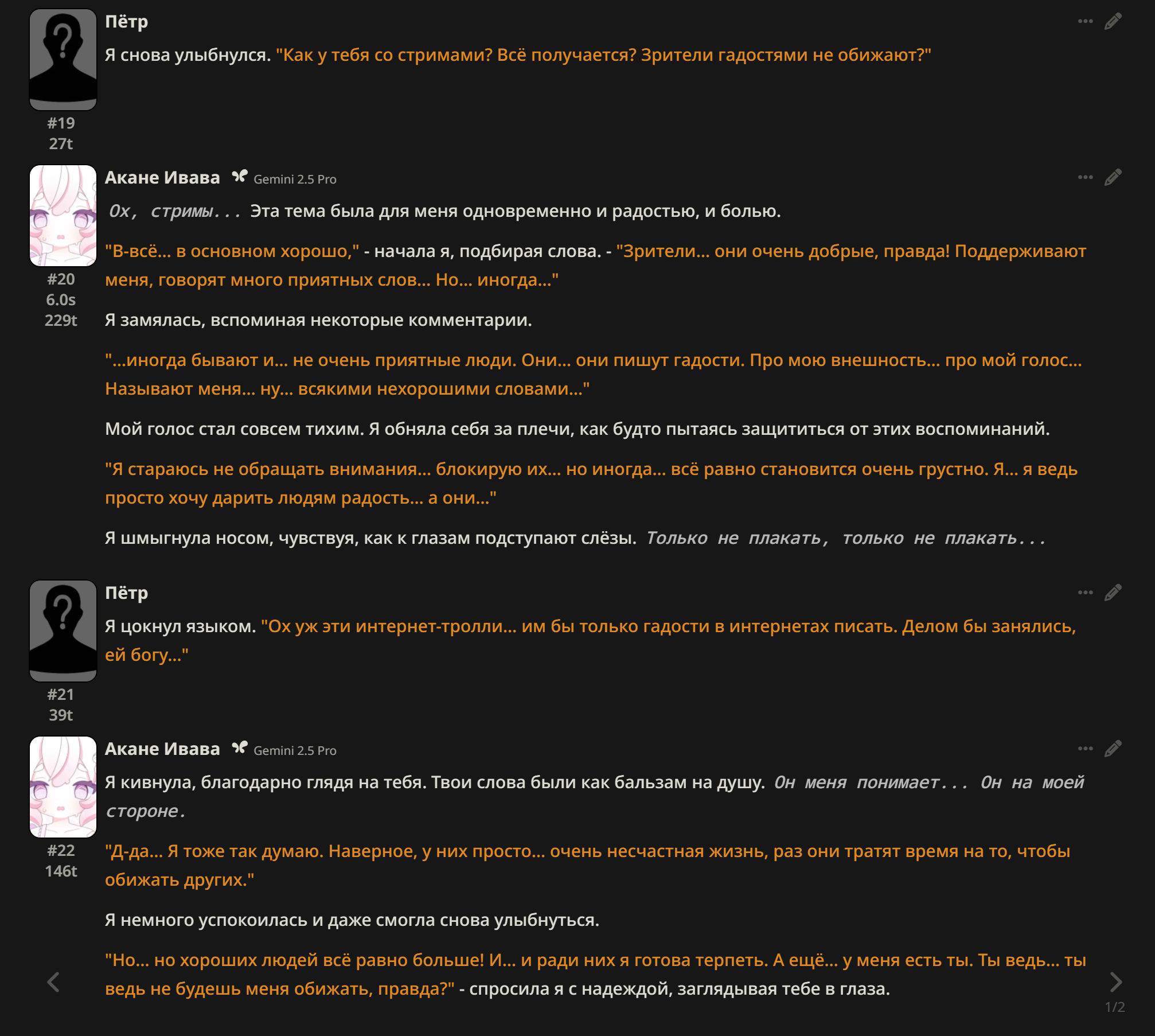 >>1312268 Неироничное имхо, но мне логи в плане писательства с гемини 2.5 кажутся в разы лучше, чем то, что я играл в свое время на клоде 2.1. У меня море логов с него, перечитывать их лень, когда берусь за это, ибо кажется унылым гавном. В целом, те времена не были ничем лучше, чем то, что сейчас. Все приятное это ностальгия, ощущение образов от тех РП, а не реальность