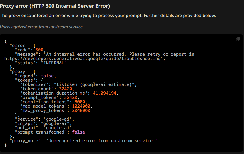 >>1312140 Поставь чистую таверну и на голом пресете попробуй отправить, может это таверна или провайдер. Заодно поставь удалялку свайпа с ошибкой если напрягает https://rentry.org/waoizenw
