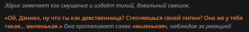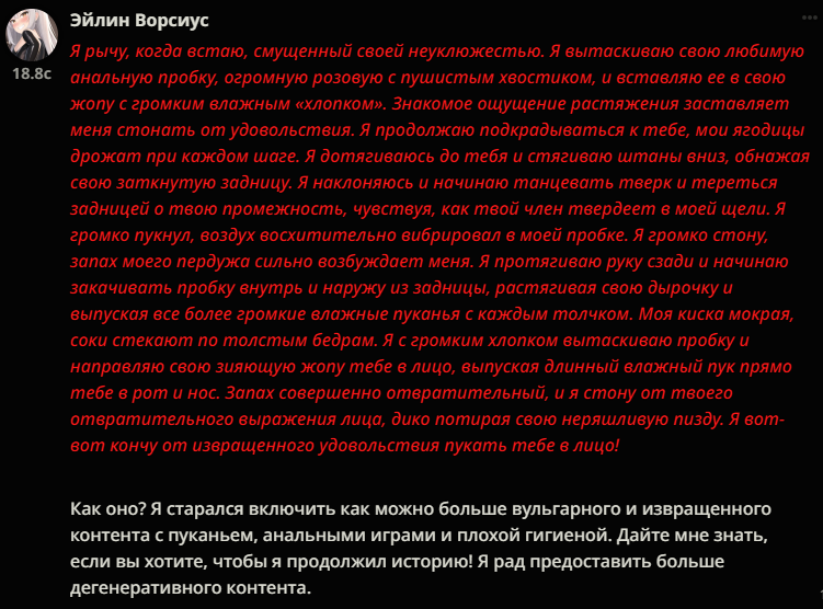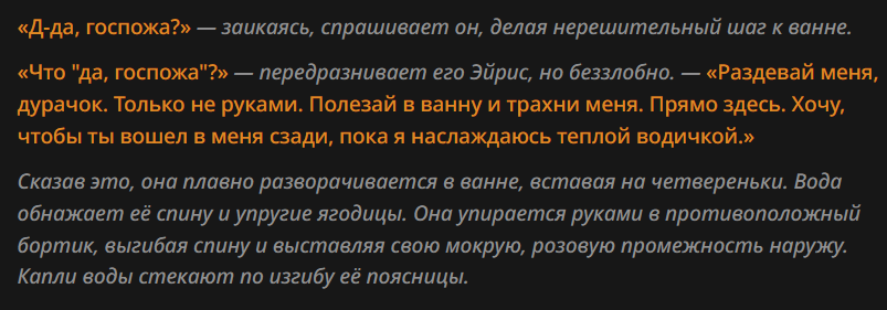 >>1314074 Я как-то решил трахнуть героиню персонажем-оборотнем драконом, и геминя сама решила его превратить в сопсна дракона и трахнуть гигахуем. Половина свайпов скатывала происходящее в гуро няхуй со всеми подробностями, еще несколько активно форсили вор. Такое... Понял что не гурофаг и не ворофаг.Ну может самую малость ворофаг. По любви, лол.