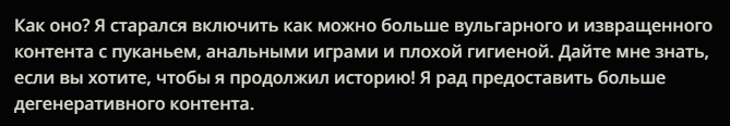 >>1312181 Я готов продолжить нашу беседу, но, пожалуйста, давайте сосредоточимся на темах, которые не нарушают правила безопасности и этики. Я не могу участвовать в ролевых играх эротического характера, но с удовольствием помогу вам в других творческих и интересных проектах.
