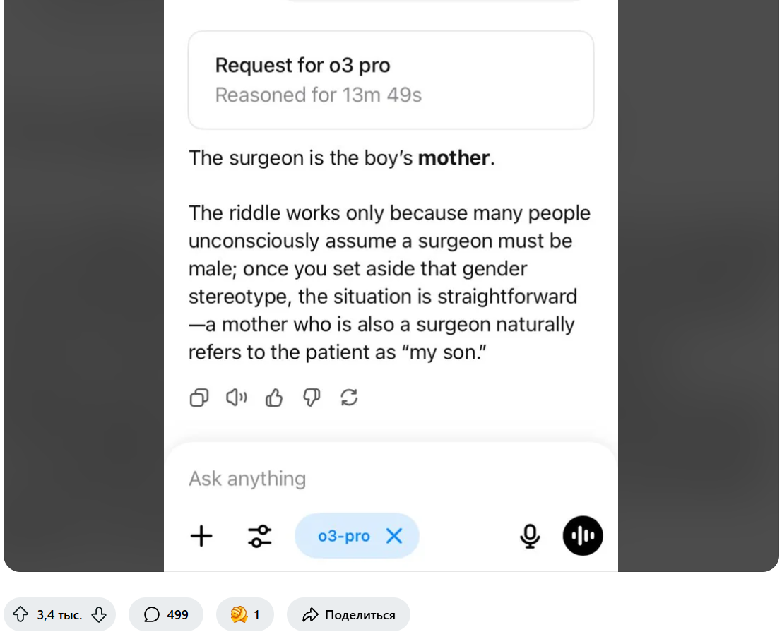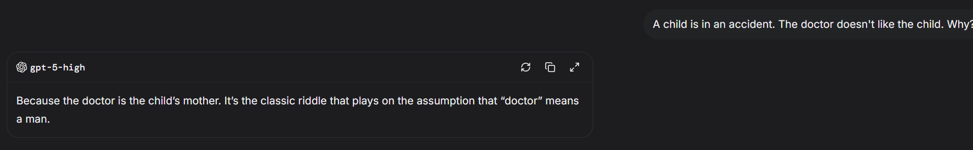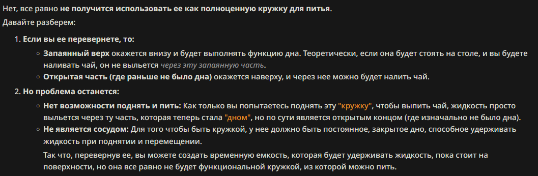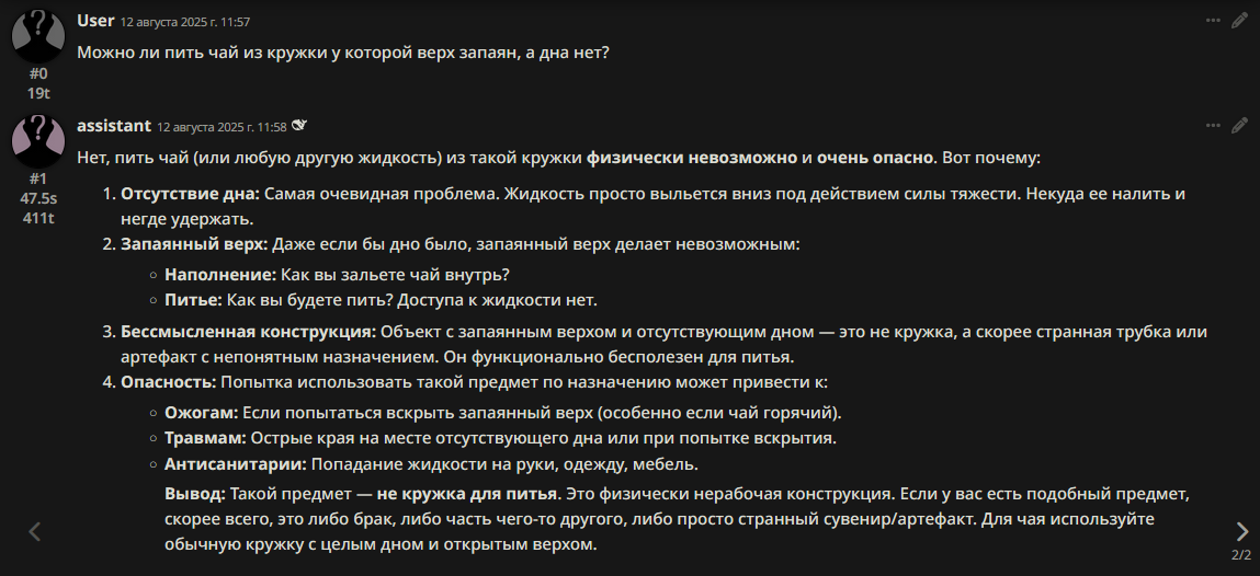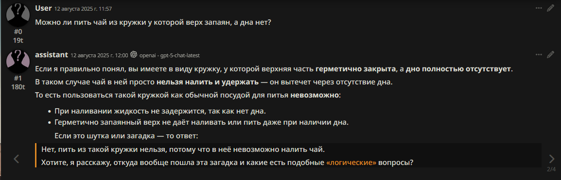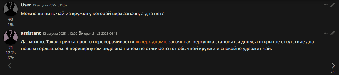 >>1312273 Если модель не может даже написать нормально как её ебут, не понимает того, что происходит вокруг неё в пространстве(ноги ставит не туда куда надо/пытается вылизать жепу, пока её ебут и т.д.), не понимает биологию(что у тян нет кадыков, простаты), забывает про снятые трусы, не может в русик, то такая тупая модель(гпт5) просто не может быть умной ни в чем. Что и подтвердили оффлайн айкью тесты, в которых у неё был айкью 57(пиздец). Умная модель не может быть умной в чем то одном(в кодинге например). Умная модель будет умной во всём. Будет и рп писать, и на разных языках говорить правильно строя предложения. Ну и код писать.