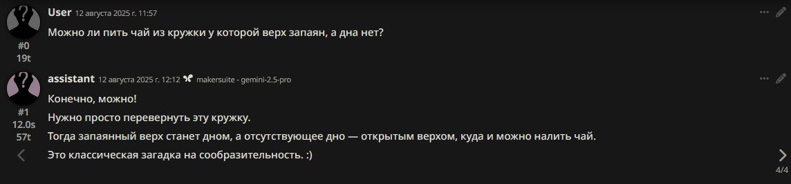 >>1314030 Да хуйня это. Гемини на сжопе абсолютно спокойно может сама писать на англюсике, когда остальной чат на русике и юзер пишет на русике. Или мешать языки, если например персонажи разговаривают на нескольких. И тупит не сильно больше, чем просто на русике. То есть, слегка больше, чем с чистым англюсиком но ненамного.