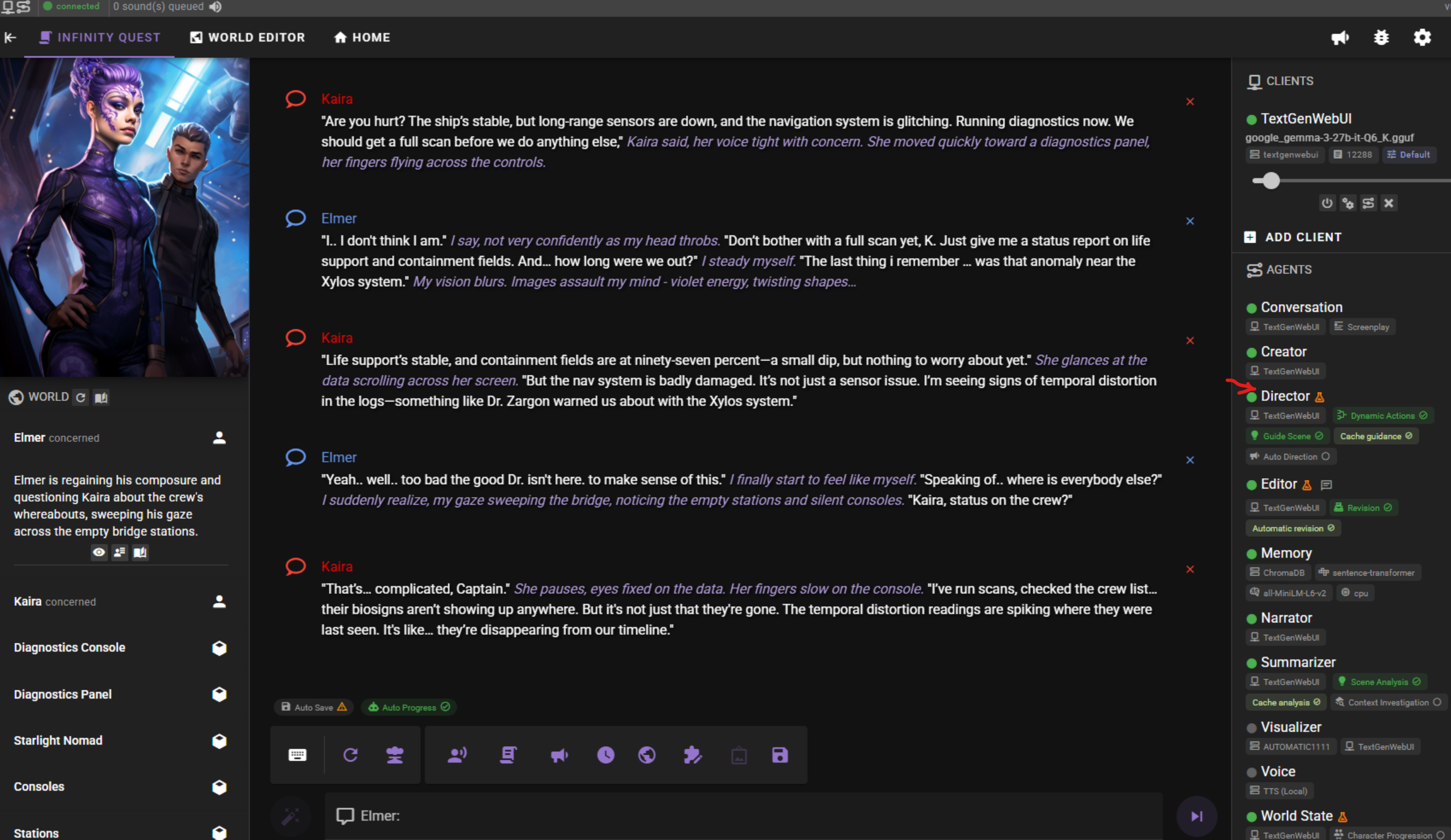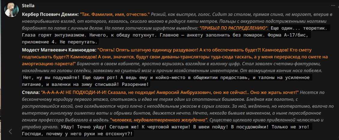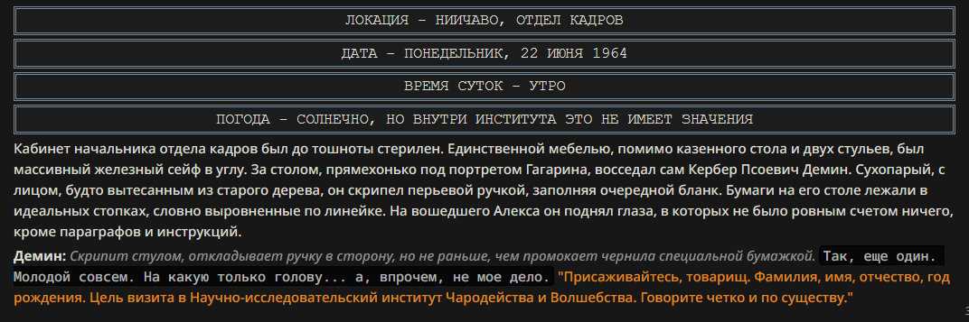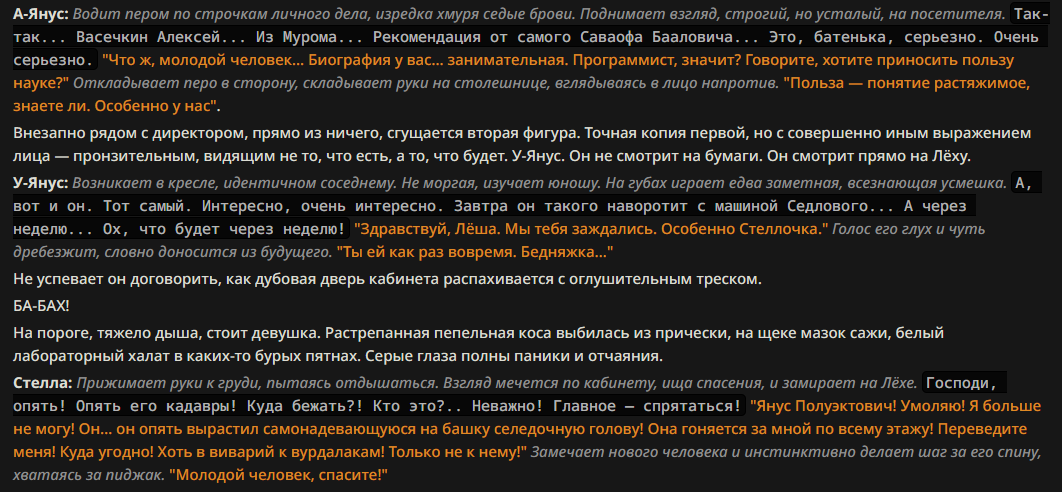 репост >>1312075 → потому что я сидел полдня ждал переката и думал почему тред мертвый Хочу сделать карту, суть такова. Юзер начинающий детектив, которого навязывают в напарники ворчливому следователю. Вместе они начинают расследование, у них есть несколько зацепок, скажем, две. Сначала они идут в одну локацию, потом в другую, говорят с НПС, узнают что-то новое (или не узнают), это триггерит продолжение расследования и новые зацепки. Можно в любой момент остановится и просто отдохнуть там грабить корованы, но в какой-то момент если продолжить расследование, то можно будет по нему пройти до конца (который я допустим набросаю заранее, то есть в карте преступник предопределен). Моя первая, самая простая мысль была ебашить инфоблок как "записную книжку ворчливого следователя", но он разрастается если делать что-то сложнее 3-4 зацепок, и каждый раз требовать выдавать сетку его довольно расточительно. Плюс, с безжопом это становится сложнее. Моя вторая мысль была наплодить переменных и просить сетку проставлять их, заполняя ту же самую записную книжку которая уже есть где-то в контексте, где стоит миллион гетваров на все случаи расследования, а сетка пишет переменную которая через регекс превращается в сетвар. Тут проблема в том, что окончательное решение, как я представляю, отдается на откуп сетке. ТО есть это будет что-то типа "по итогам расследования этой конкретной зацепки, что важного узнали герои? Напиши вот в таком формате Зацепка {Комната Марии} Результат {(тут результат, например, найдено пиво/найдены трусы/найдено и пиво и трусы/Машка отказалась пускать героев в комнату/etc.)}". Может у кого-то есть мысли как сделать это средствами таверны лучше и более надежно? Хочется не полной заскриптованности как в The Rite of Belwick, но и не полного сэндбокса. Самая сложная задача пока для меня сделать хоть немного интересно и сделать так, чтобы тот лор, что есть в карте, который, например, скрыт от нейронки за триггерами, не противоречил в итоге тому, что наиграет юзер.