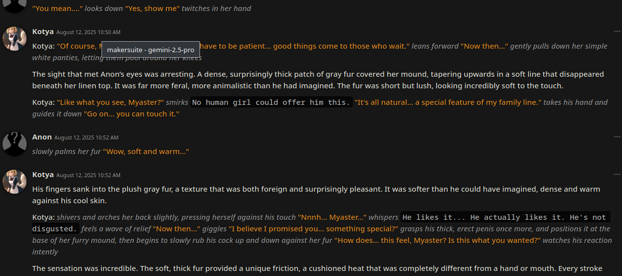 Я сидел на сонете 3.7 с курсора и я могу сказать, что джемини 2.5 про буквально на голову выше(я скидывал лог, где фута-мамочка заперла мой член в клеточку). Нужно быть слепым, чтобы этого не видеть. Была бы джемини нефильтрованная вообще бы ей цены не было.