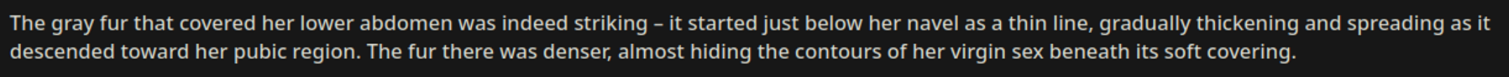 Every oddly specific detail is always described in all nasty nuances, especially details about: cunt, dick, ass, anus, mouth, sounds, smells, orgasms, cum, saliva, drool, breasts, fucking, sucking, licking, gagging, panties, body parts, body liquids.