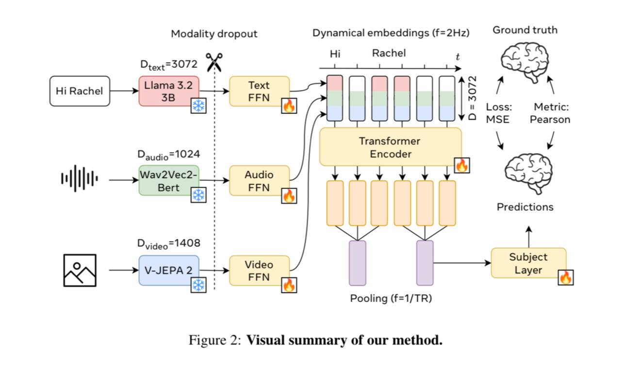➖ Для каждой модальности воткнули отдельный энкодер для получения эмбеддингов. Причем все свое, домашнее: для текста Llama-3.2-3B, для видео Video-JEPA 2, для аудио Wav2Vec2-BERT-2.0. Все эмбеддинги приводятся к частоте 2Гц (2 временных точки в секунду), чтобы синхронизироваться между собой и с fMRI-откликами.