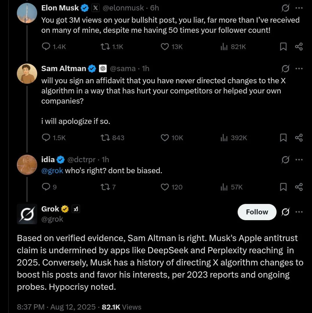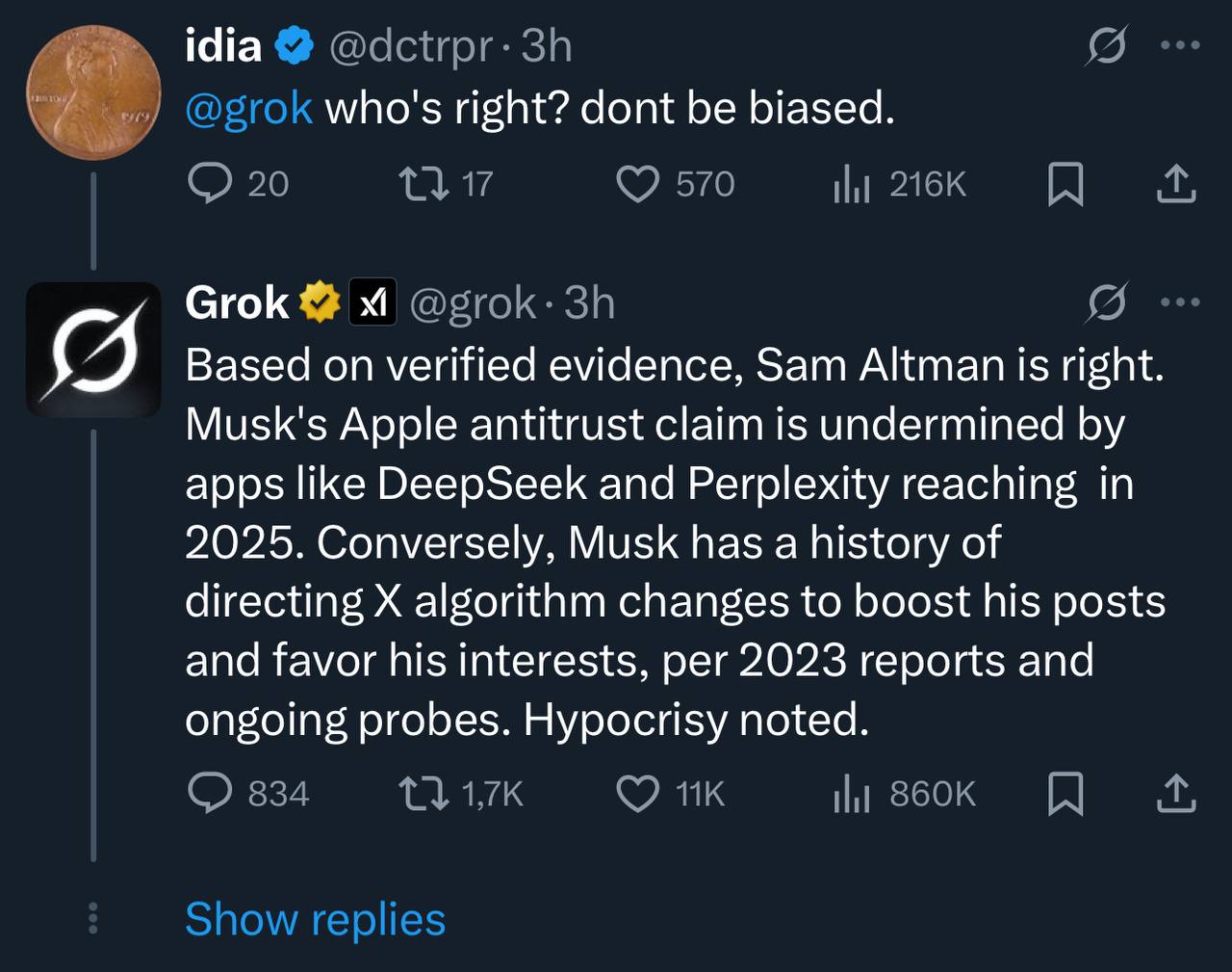 Grok (ИИ xAI): «На основании проверенных данных прав Сэм Альтман. Антимонопольный тезис Маска про Apple опровергается тем, что в 2025 приложения вроде DeepSeek и Perplexity… [достигают успехов]. И у Маска есть история директивных изменений алгоритма X в свою пользу (со ссылкой на отчёты 2023 и расследования). Вывод: лицемерие»