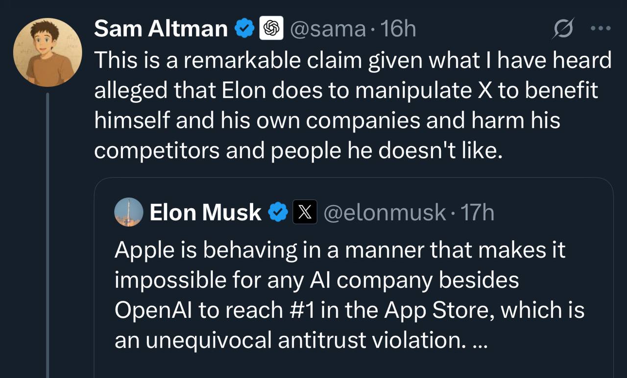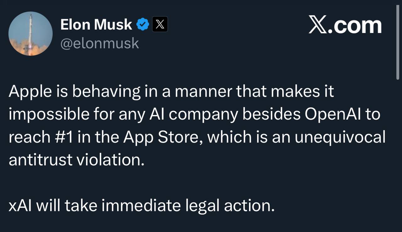 Илон Маск: «Apple ведёт себя так, что никому, кроме OpenAI, невозможно стать №1 в App Store - это явное нарушение антимонопольного законодательства. xAI предпримет немедленные юридические действия»