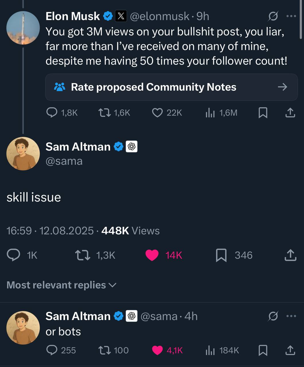 Илон в ответ Альтману: «У твоего вброса 3 млн просмотров, лжец, больше, чем у многих моих постов, хотя у меня в 50 раз больше подписчиков!» (в стиле «как так?»).
