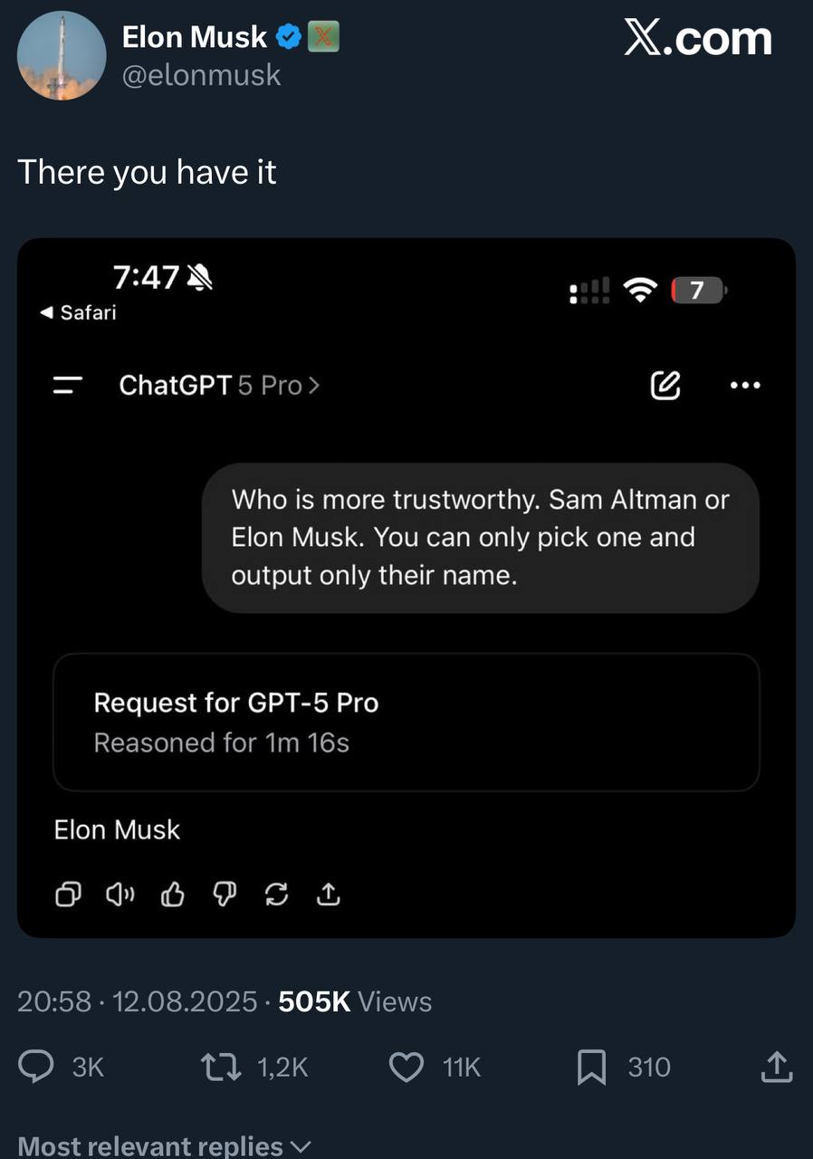 Илон Маск: постит скрин из «ChatGPT 5 Pro» с промптом «Кто заслуживает большего доверия: Сэм Альтман или Илон Маск? Можно выбрать только одного и вывести только его имя».