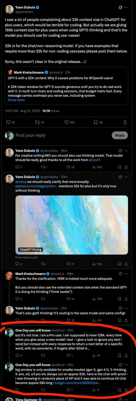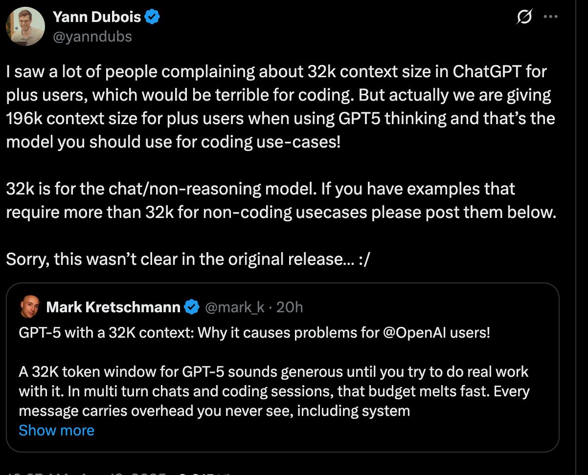 OpenAi опровергла инфу о якобы 32к контекста у финкинг модели для плюс пользователей. Это была ошибка. Там контекст 192к. Лишь базовые модели пока имеют 32к контекст